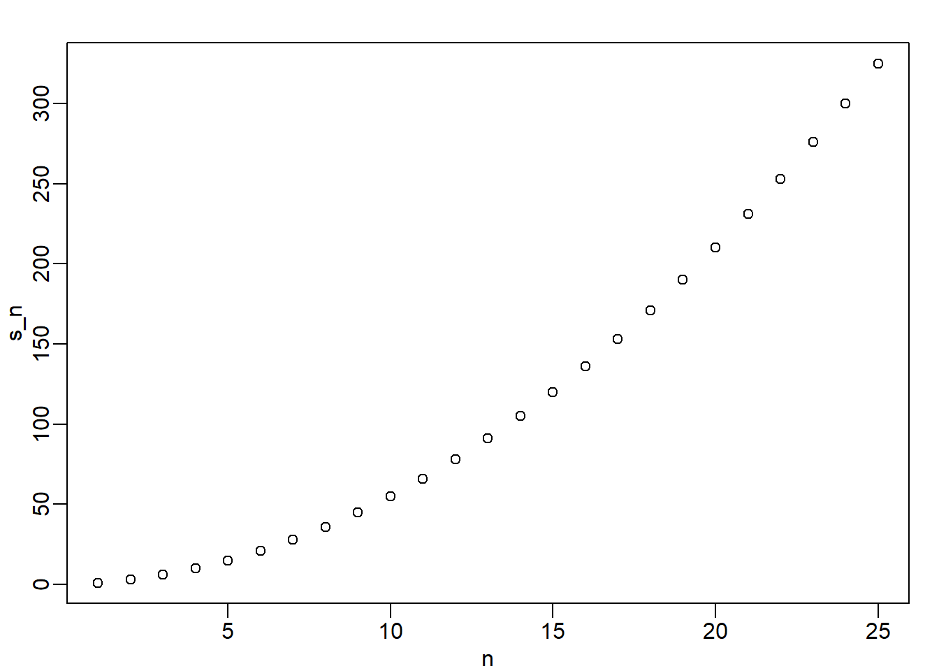 Create a data.frame holding \(n\) and \(S_n\). Plot \(S_n\) versus \(n\). Use points defined by \(n=1,\dots,25\).