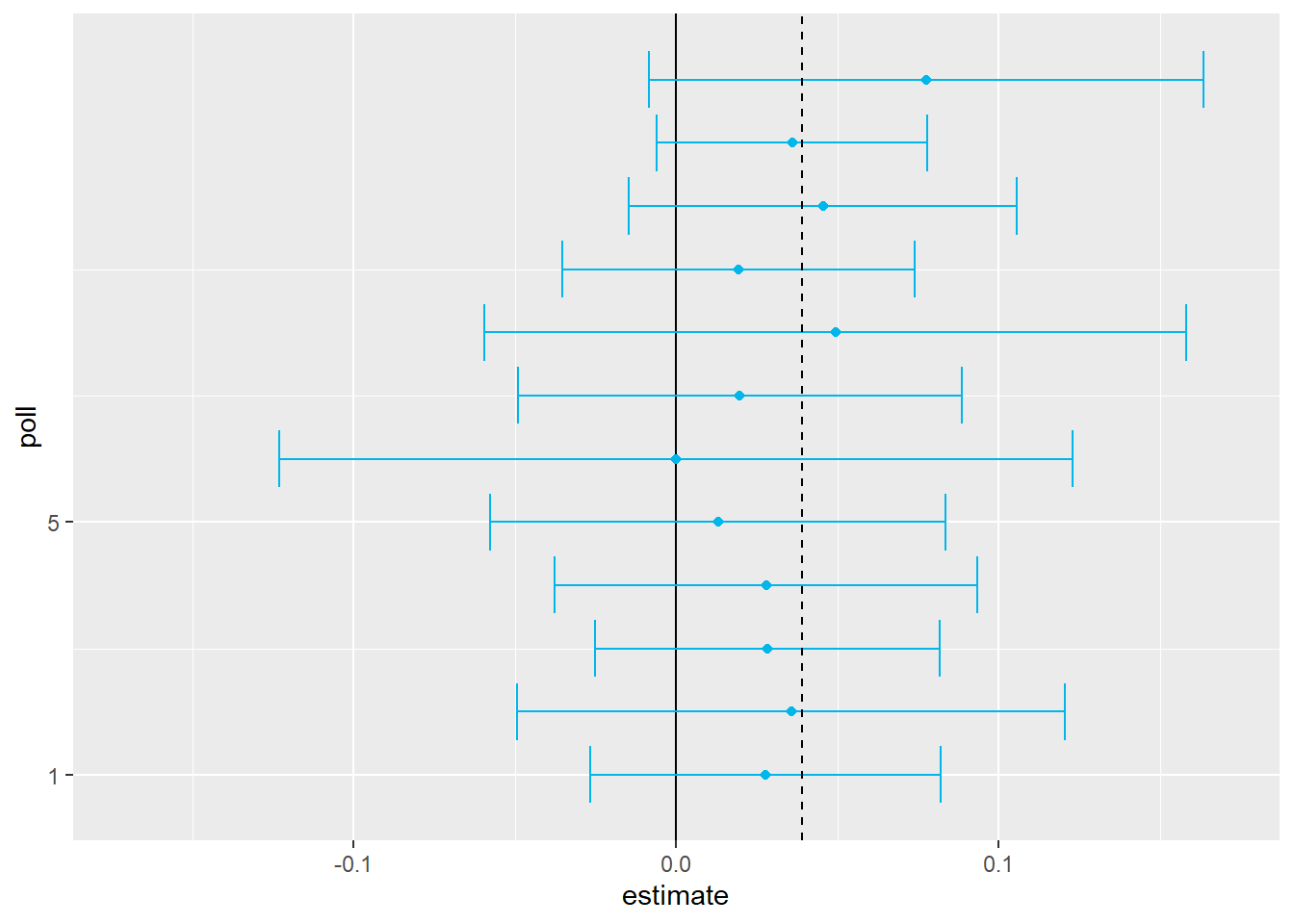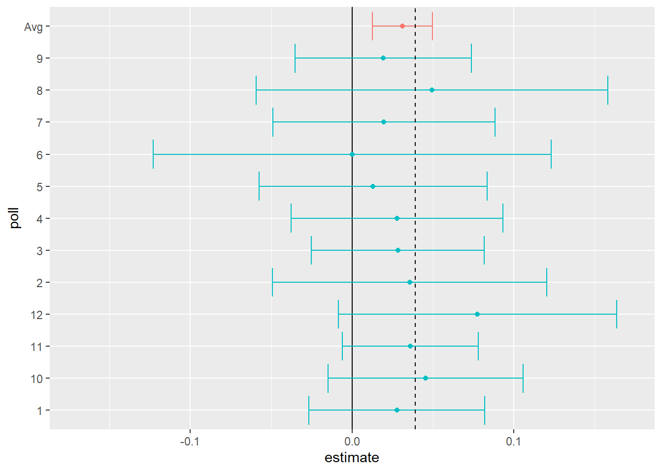 Not surprisingly, all 12 polls report confidence intervals that include the election night result (dashed line). However, all 12 polls also include 0 (solid black line) as well. Therefore, if asked individually for a prediction, the pollsters would have to say: it’s a toss-up. Below we describe a key insight they are missing.