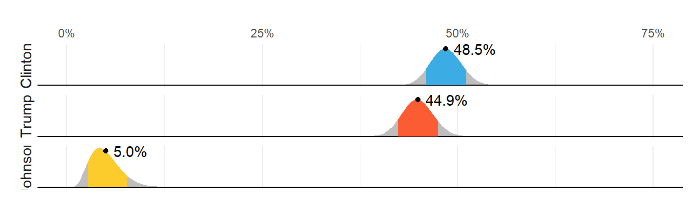 Although not nearly as interesting as predicting the electoral college, for illustrative purposes we will start by looking at predictions for the popular vote. FiveThirtyEight predicted a 3.6% advantage for Clinton4, included the actual result of 2.1% (48.2% to 46.1%) in their interval, and was much more confident about Clinton winning the election, giving her an 81.4% chance. Their prediction was summarized with a chart like this: