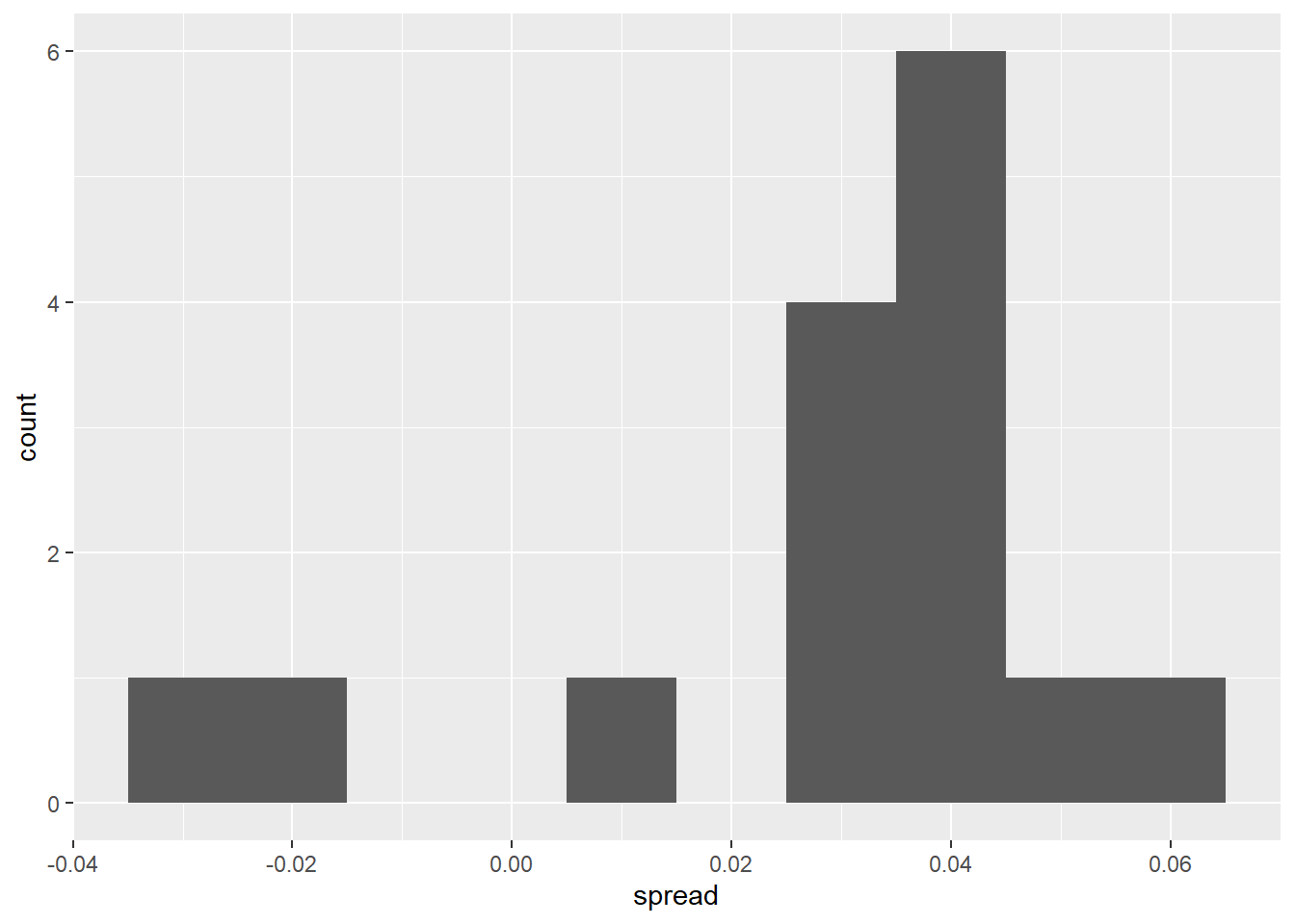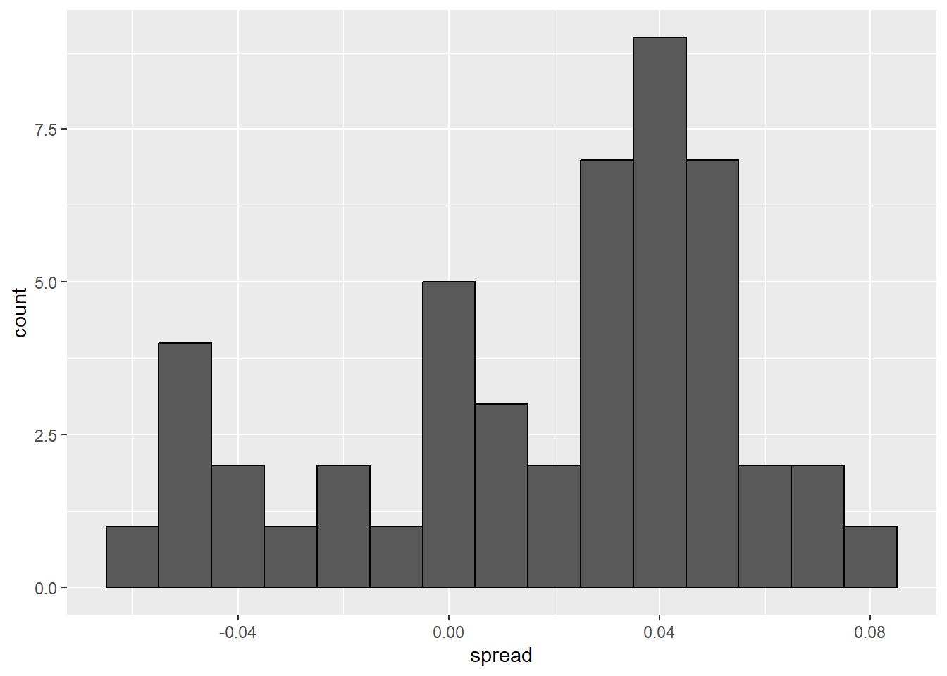 In the previous section, we saw that using the urn model theory to combine these results might not be appropriate due to the pollster effect. Instead, we will model this spread data directly.