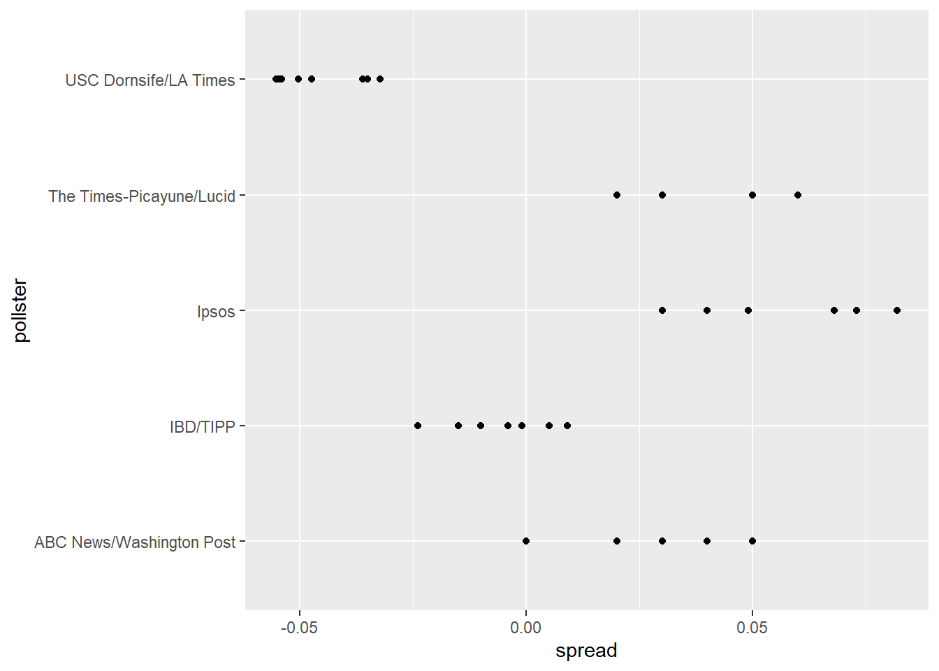 is between 0.018 and 0.033, which agrees with the within poll variation we see. However, there appears to be differences across the polls. Note, for example, how the USC Dornsife/LA Times pollster is predicting a 4% win for Trump, while Ipsos is predicting a win larger than 5% for Clinton. The theory we learned says nothing about different pollsters producing polls with different expected values. All the polls should have the same expected value. FiveThirtyEight refers to these differences as “house effects”. We also call them pollster bias.