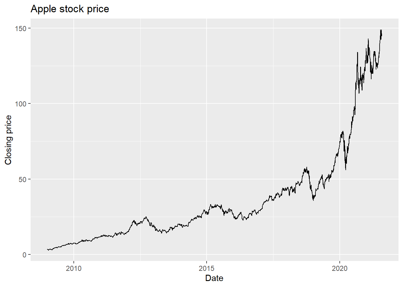 labs(x = 'Date', y = 'Closing price', title = 'Apple stock price')
