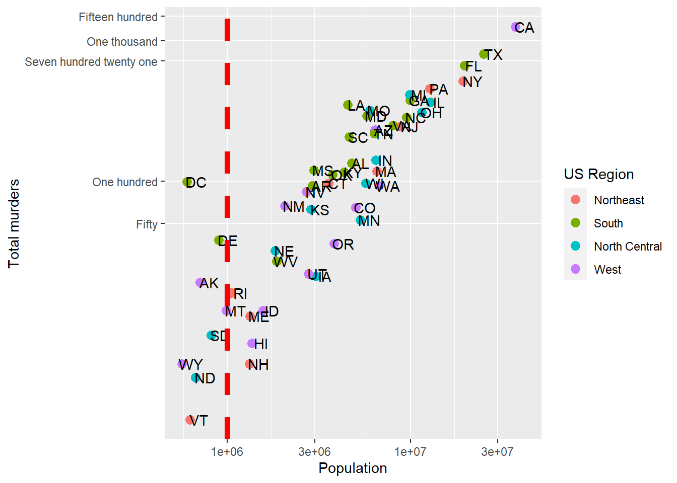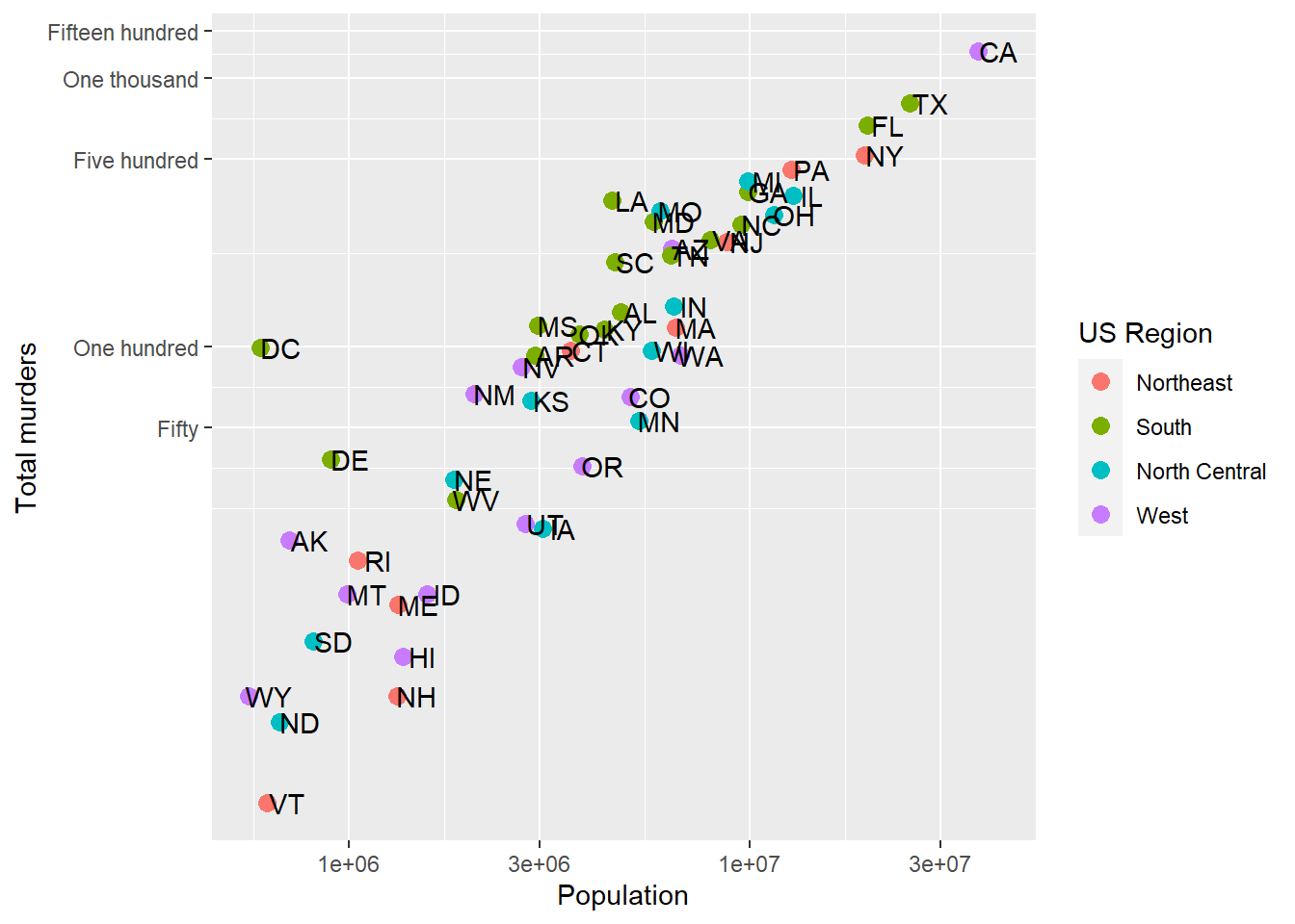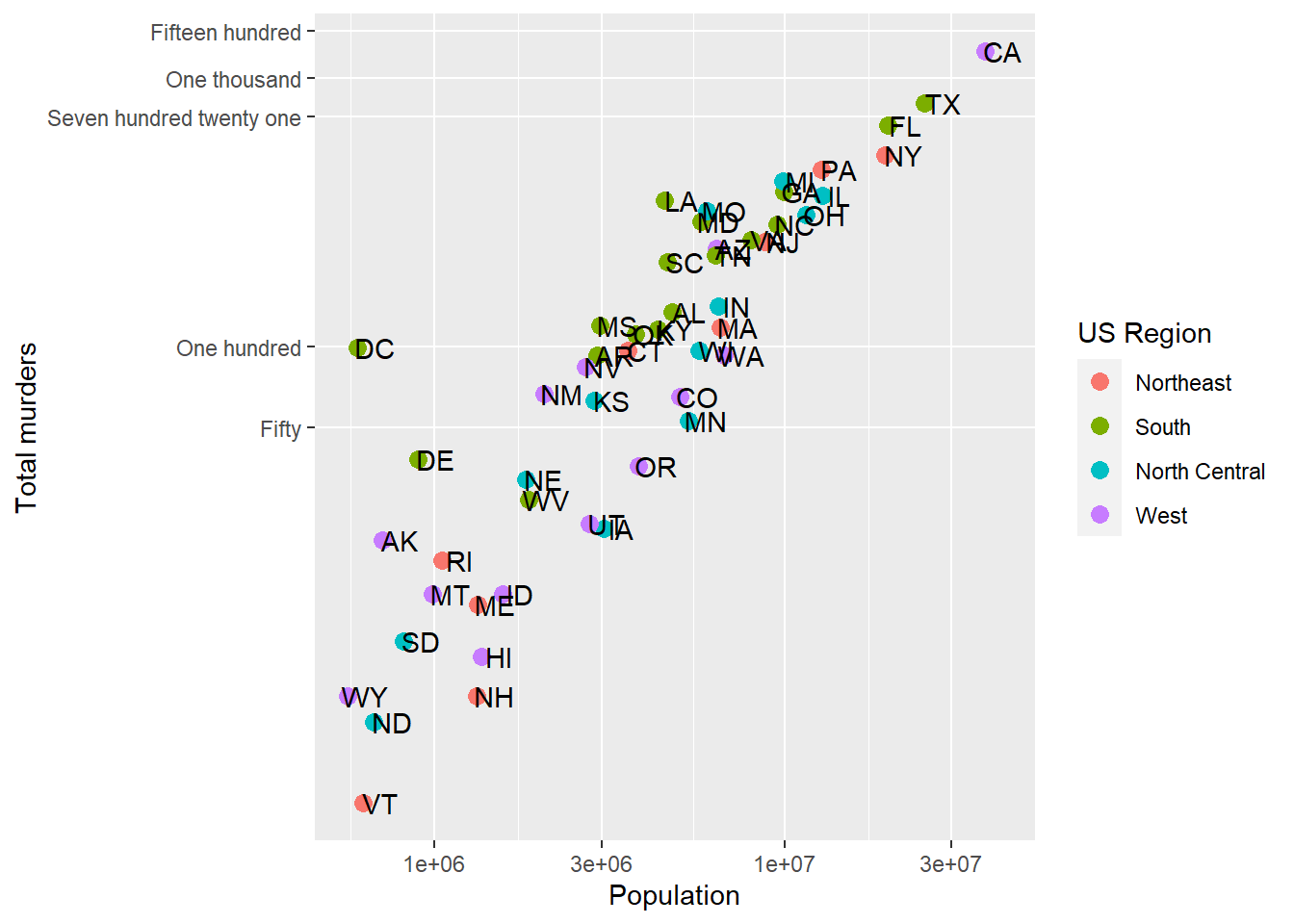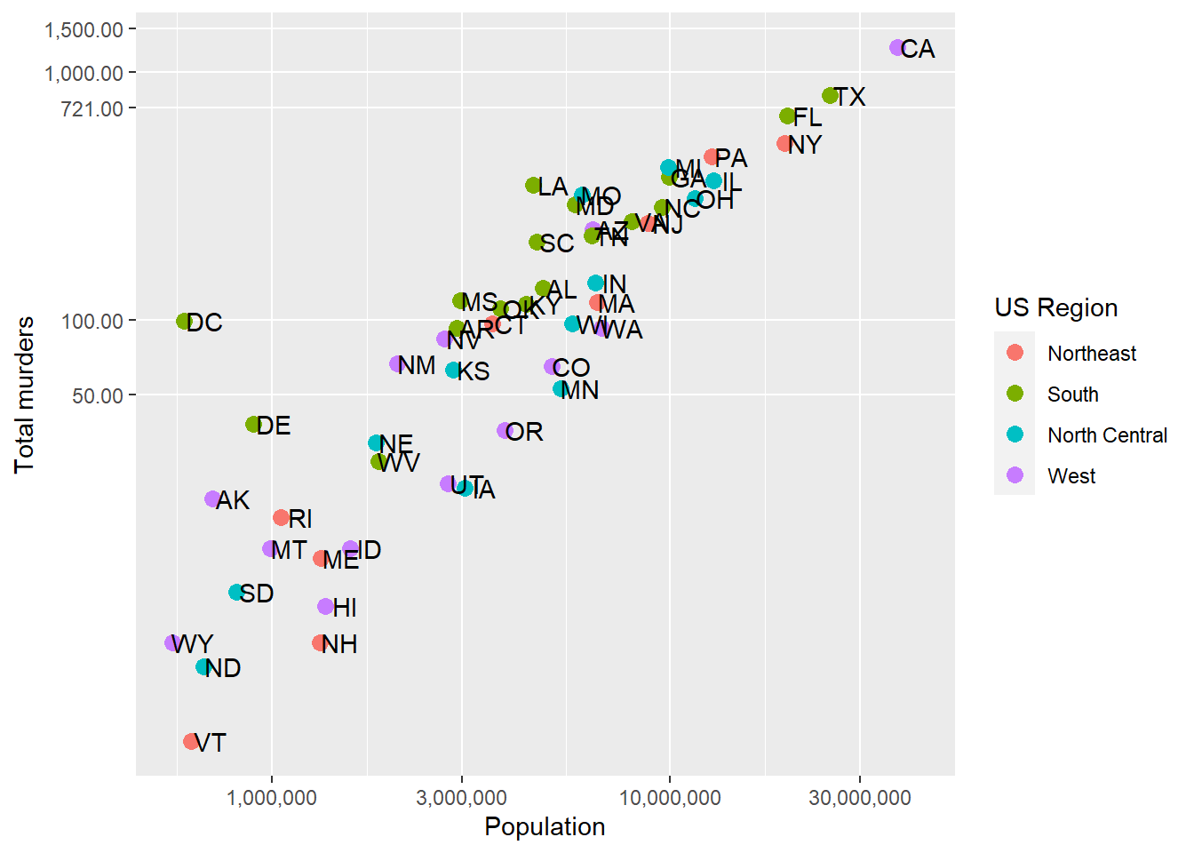 This avoids using scale_x_continuous or it’s child function scale_x_log10. One advantage to using scale_x... is that the axes are correctly labeled. When we transform the data directly, the axis labels only show the transformed values, so 7,000,000 becomes 7.0. This could be confusing! We could update the axis labels to say “total murders (log base 10)” and “total population (log base 10)”, but that’s cumbersome. Using scale_x... is a lot more refined and easy.