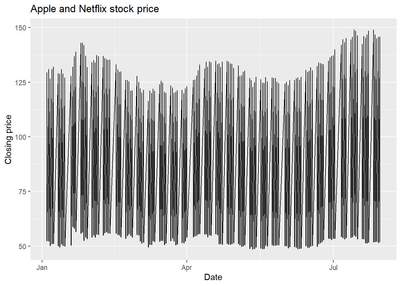 That looks kinda strange. That’s because, for every date, we have two values - the NFLX and the AAPL value, so each day has a vertical line drawn between the two prices. This is nonsense, especially since what we want to see is the history of NFLX and AAPL over time.
