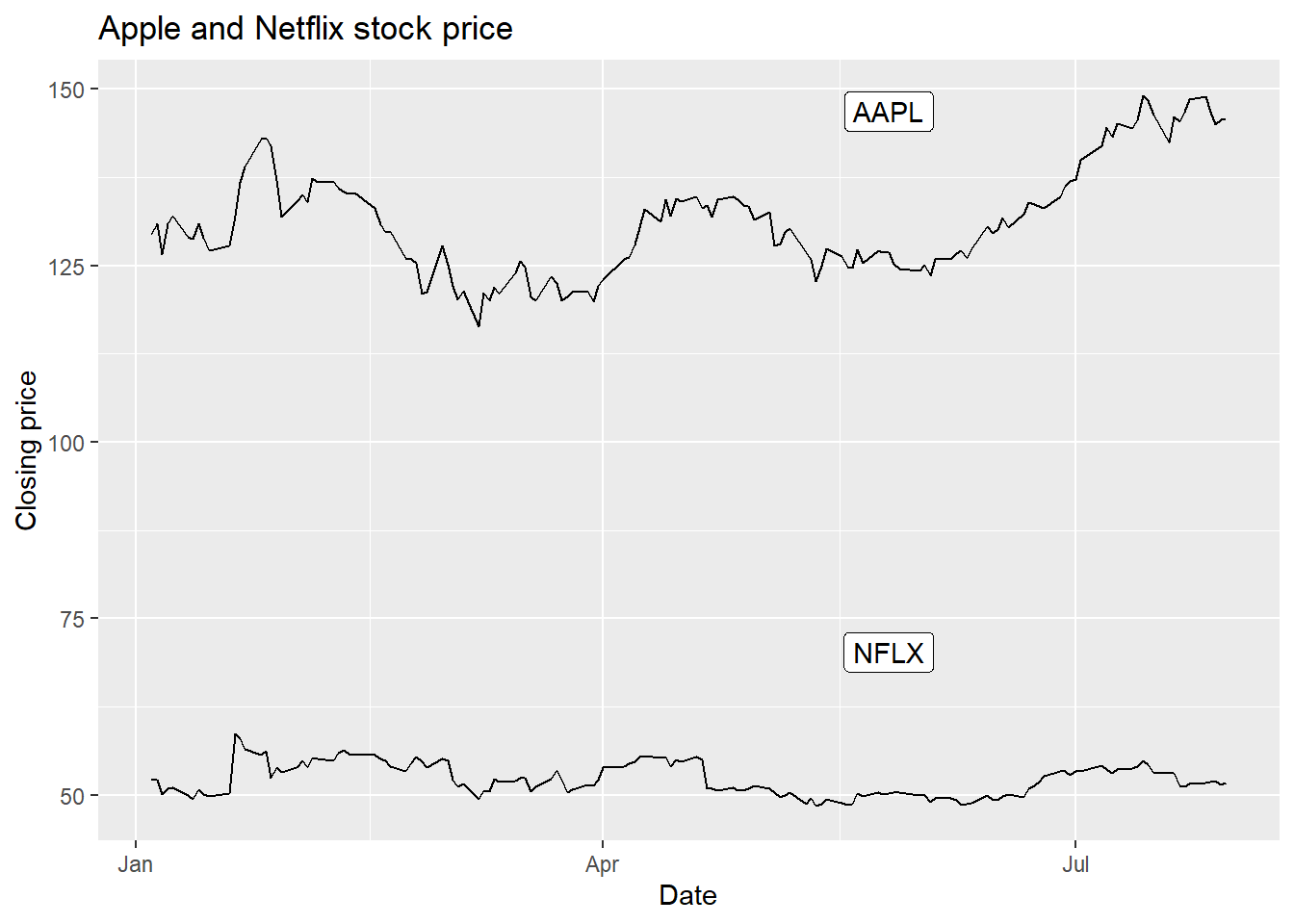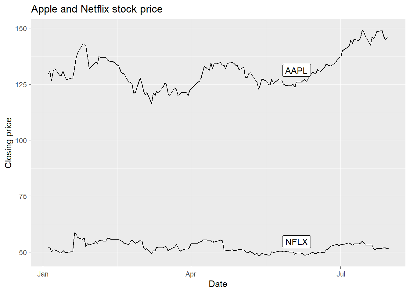 labs(x = 'Date', y = 'Closing price', title = 'Apple and Netflix stock price')