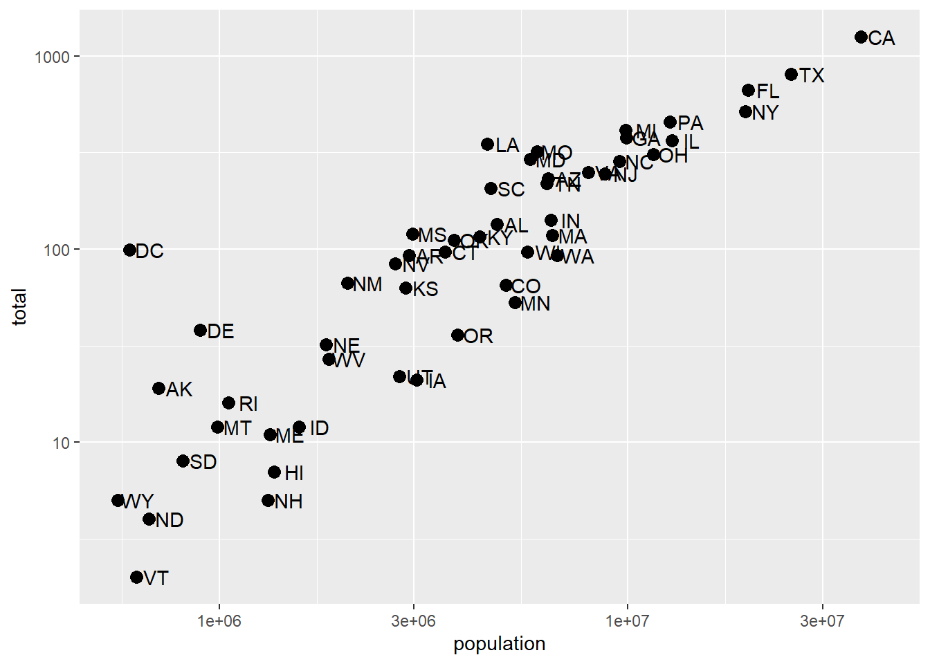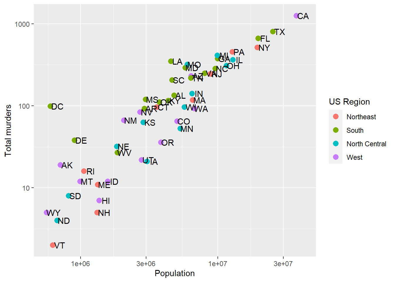 p <- ggplot(data = murders, aes(x = population, y = total, label = abb))Visualizations in Practice