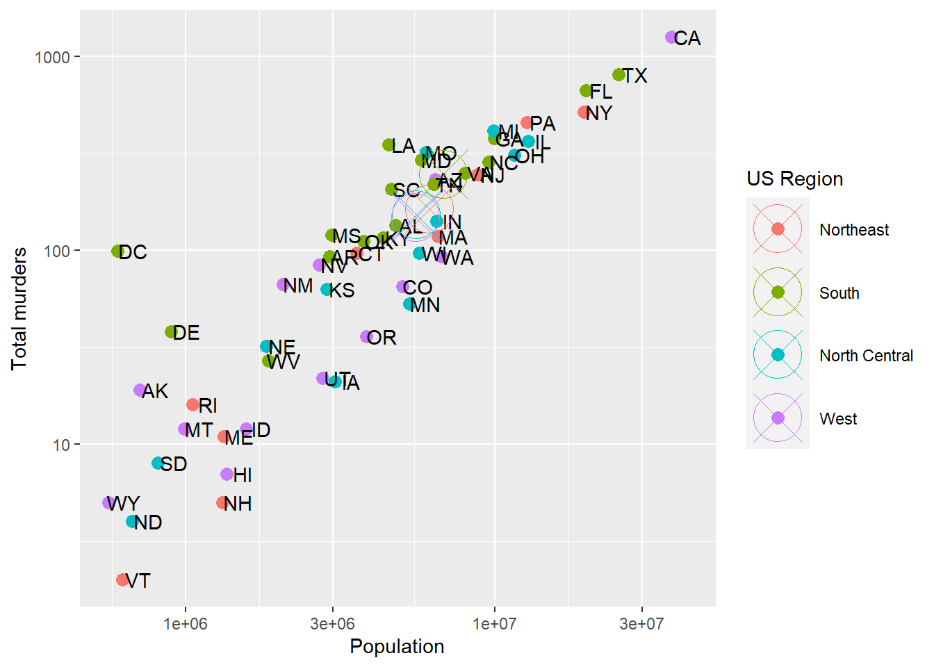 Perhaps we would like to summarize the regional average Population and Murders by adding representative points. Since we’re adding new data, we have to remove the label=abb part of the aes that inherits to each geom, which we do with label=NULL in the new point geometry: