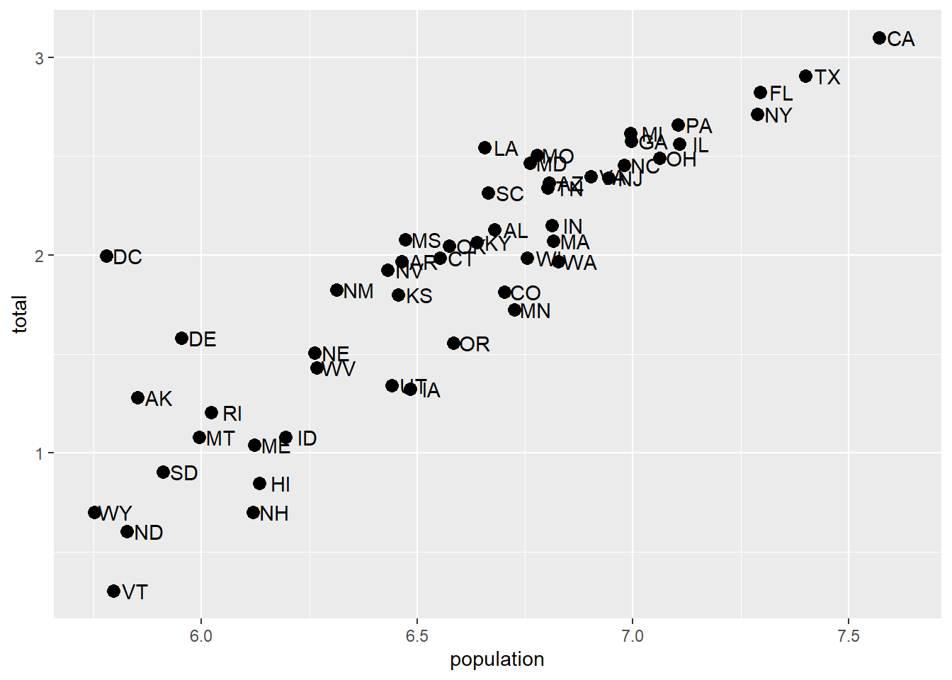 geom_text(aes(x = log(population, base=10), y = log(total, base=10)), nudge_x = 0.05)