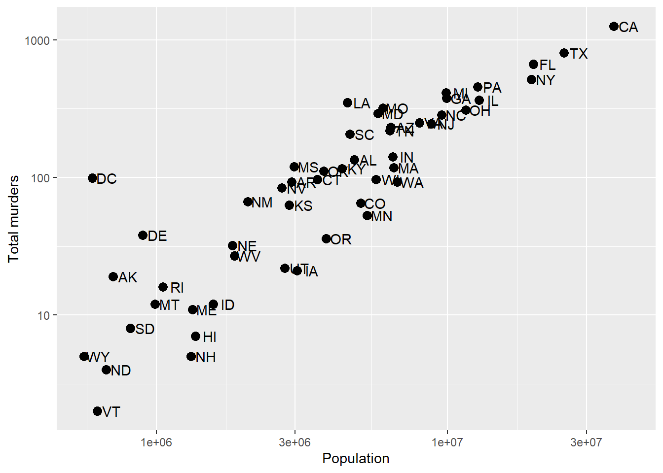 labs(x = 'Population', y = 'Total murders')
