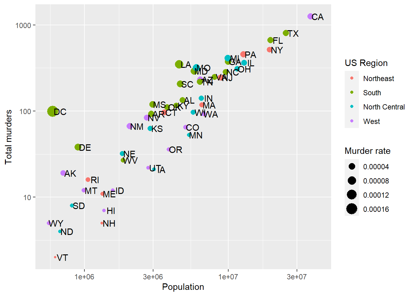 labs(x = 'Population', y = 'Total murders', color = 'US Region', size = 'Murder rate',
