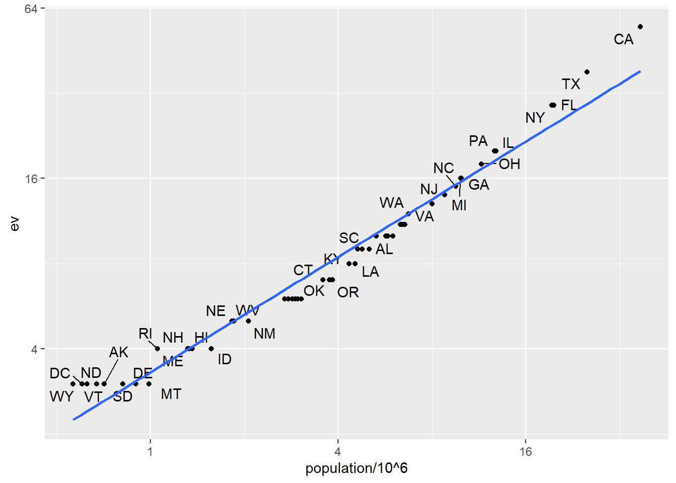Suppose we want to explore the relationship between population size for US states and electoral votes. We have the population size in this table: