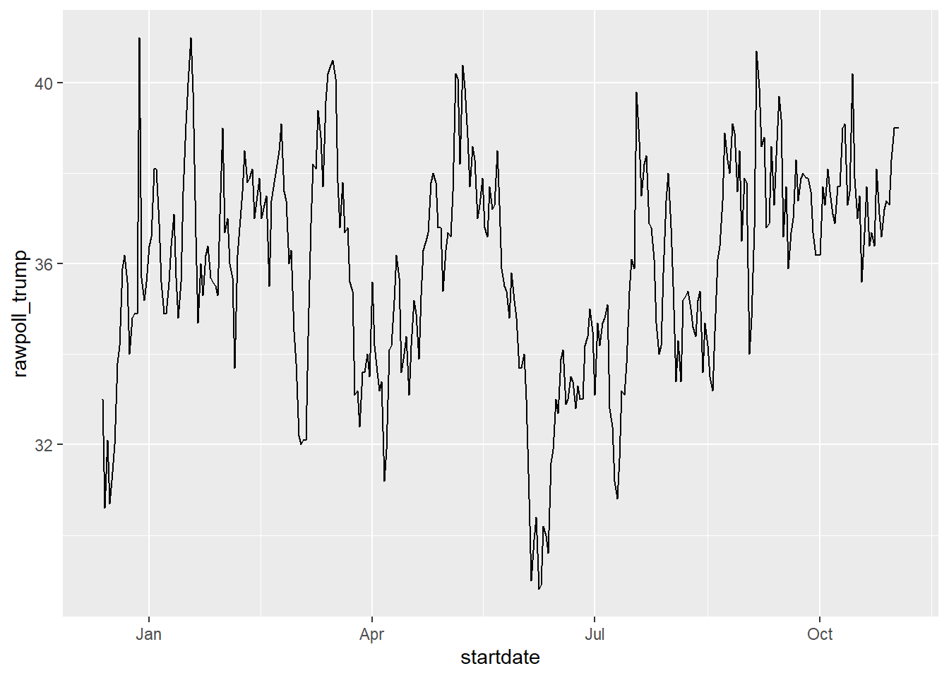 Another very useful function is the round_date. It can be used to round dates to nearest year, quarter, month, week, day, hour, minutes, or seconds. So if we want to group all the polls by week of the year we can do the following: