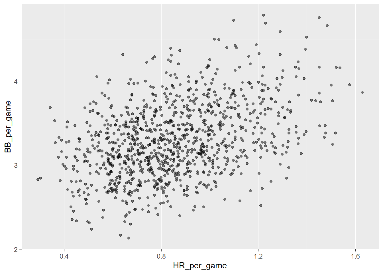 Let’s start with an obvious one: HRs. Do teams that hit more home runs score more runs? We examine data from 1961 to 2001. The visualization of choice when exploring the relationship between two variables, such as HRs and wins, is a scatterplot: