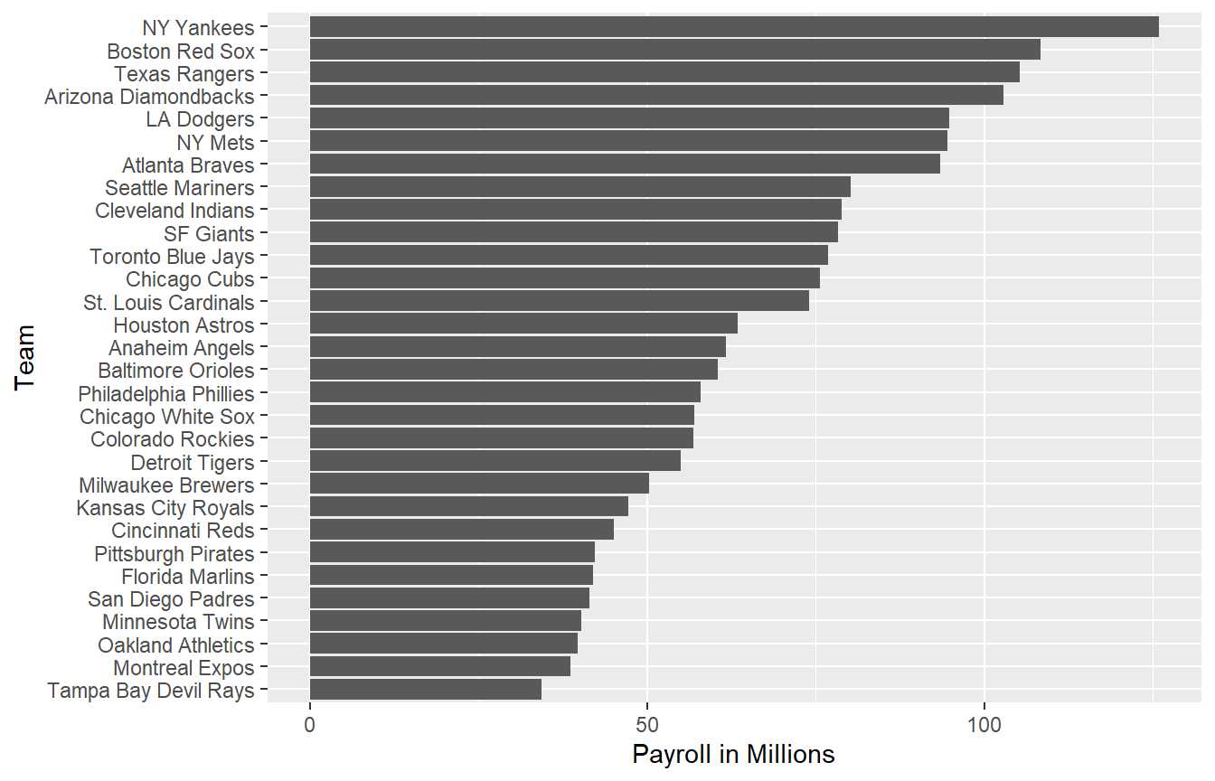 As motivation for this lecture, we will pretend it is 2002 (holy sh*t I’m old) and try to build a baseball team with a limited budget, just like the A’s had to do. To appreciate what you are up against, note that in 2002 the Yankees’ payroll of $125,928,583 more than tripled the Oakland A’s $39,679,746: