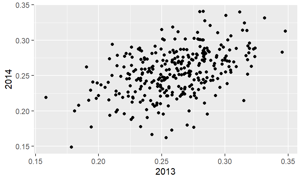 The correlation is 0.460254 and the data look very much like a bivariate normal distribution, which means we predict a 2014 batting average \(Y\) for any given player that had a 2013 batting average \(X\) with: