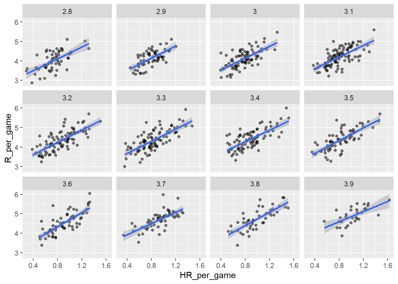 Can we use regression with these data? First, notice that the HR and Run data appear to be bivariate normal. We may have skipped the bivariate normal from before, but it just means that two variables share a joint normal distribution – each has it’s own mean, but conditional on some value of one, the other is normally distributed around it’s conditional value. We save the plot into the object p as we will use it again later.