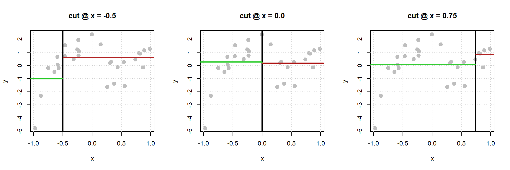 For each plot, the black vertical line defines the neighborhoods. The green horizontal lines are the average of the \(y_i\) values for the points in the left neighborhood. The red horizontal lines are the average of the \(y_i\) values for the points in the right neighborhood.