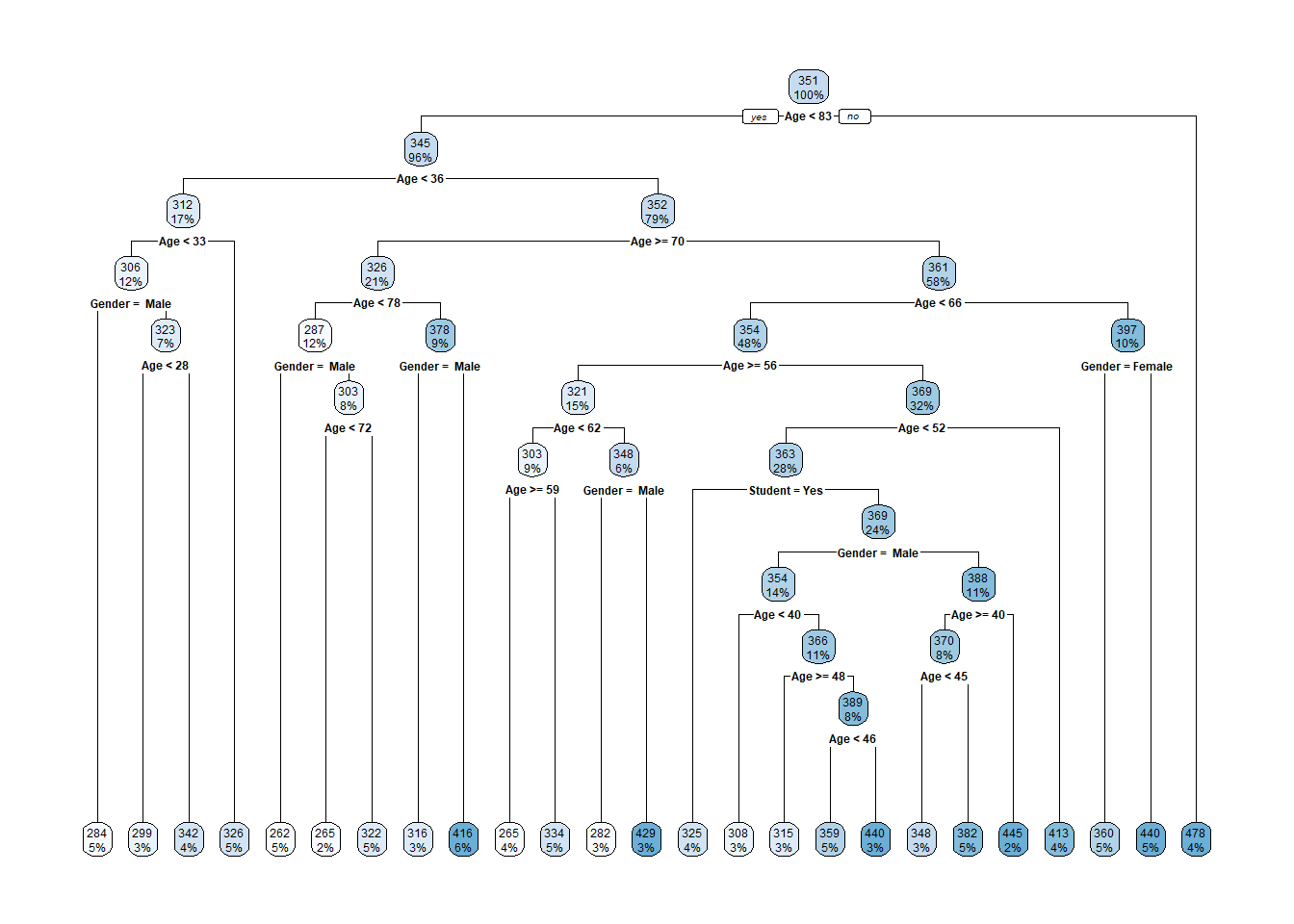 crdt_tree = rpart(Rating ~ Age + Gender + Student, data = crdt_trn, cp = .0095)crdt_treen= 320