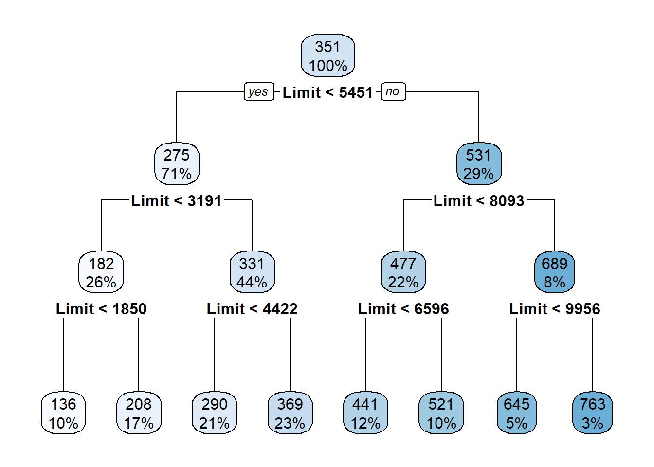 Notice that this model only splits based on Limit despite using all features. This should be a big hint about which variables are useful for prediction.