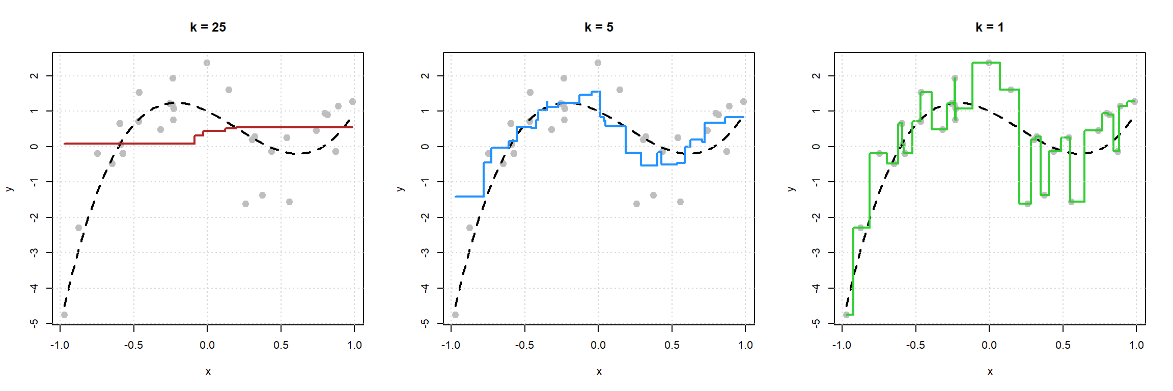 - The right plot with \(k = 1\) might not perform too well. The estimated “curve” seems to “move” too much. (Notice, that it goes through each point. We’ve fit to the noise.) This is an example of a flexible model.
