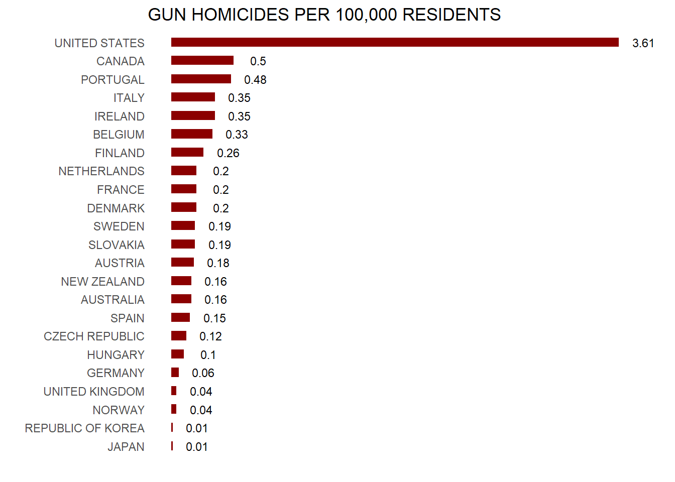 Imagine you live in Europe (if only!) and are offered a job in a US company with many locations in every state. It is a great job, but headlines such as US Gun Homicide Rate Higher Than Other Developed Countries1 have you worried. Fox News runs a scary looking graphic, and charts like the one below only add to you anxiety: