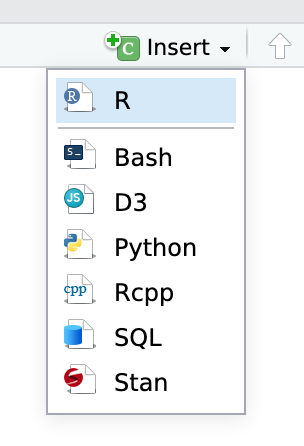 You’ll also need to insert your own code chunks where needed. Rather than typing them by hand (that’s tedious and you might miscount the number of backticks!), use the “Insert” button at the top of the editing window, or type ctrl + alt + i on Windows, or ⌘ + ⌥ + i on macOS.