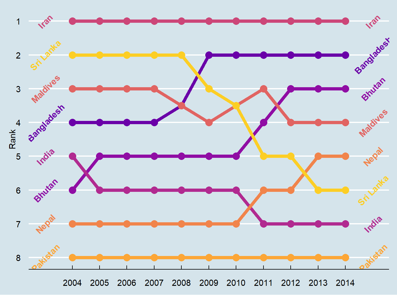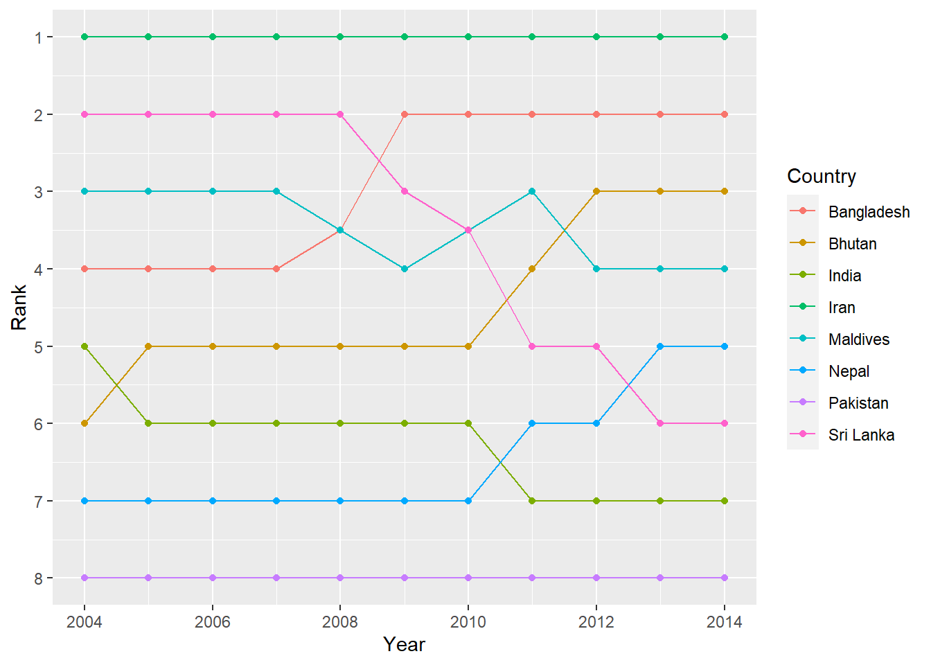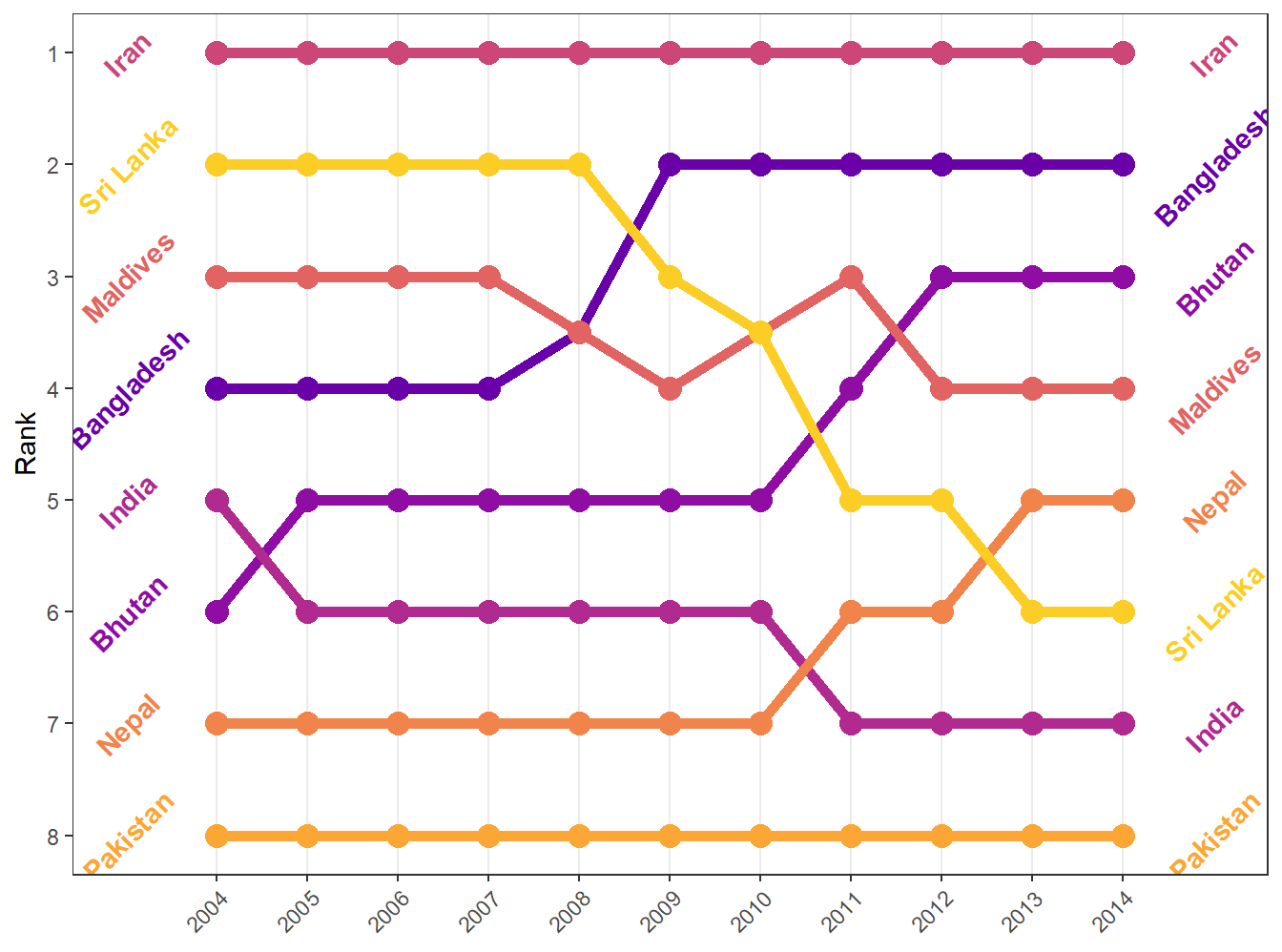 Finally, we can make a bump chart that shows changes in rankings over time. We’ll look at fertility in South Asia. First we need to calculate a new variable that shows the rank of each country within each year. We can do this if we group by year and then use the rank() function to rank countries by the fertility column.