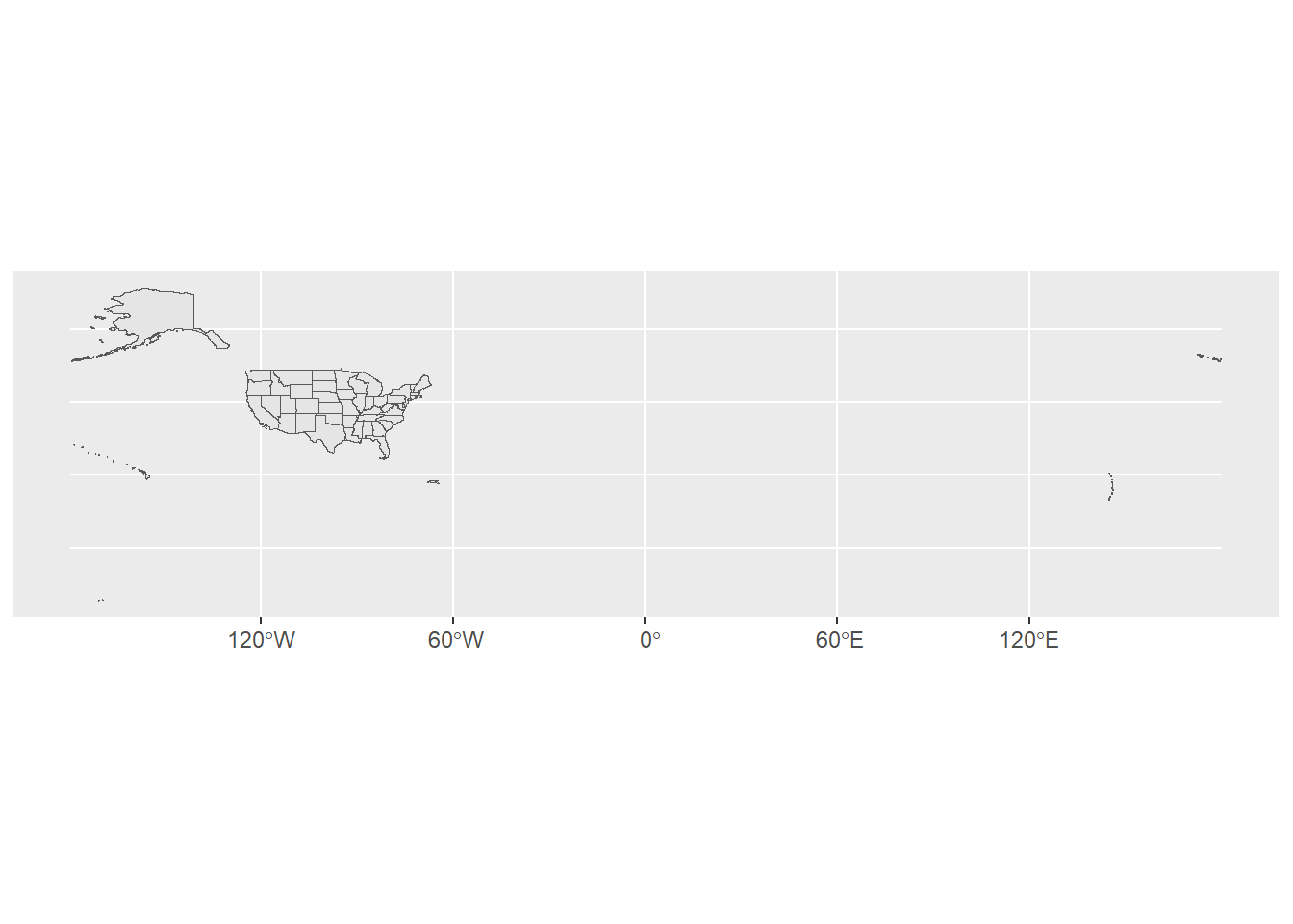 We also get all the territories, which extends the map window way out the South Pacific. Let’s use some tricks to make this better. First off, US territories have FIPS codes of 60 and above, so we can filter to get the 50 US States + DC. Then, we can shift the geometry to include AK and HI (not to scale).