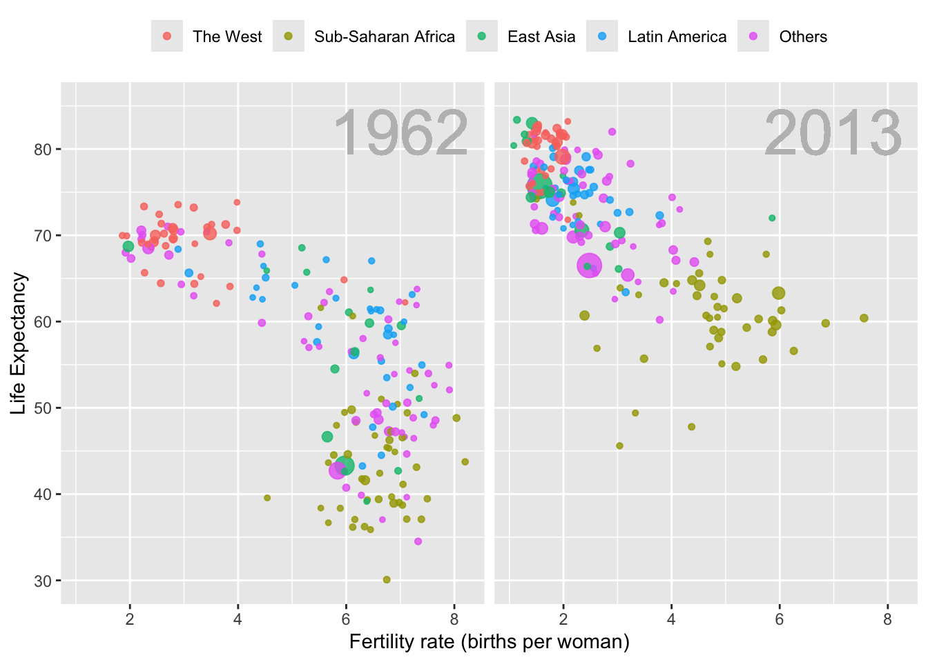 Here we see yet another useful default behavior: ggplot2 automatically adds a legend that maps color to region, and size to population (which we scaled by 1,000,000). To avoid adding this legend we set the geom_point argument show.legend = FALSE. This removes both the size and the color legend.