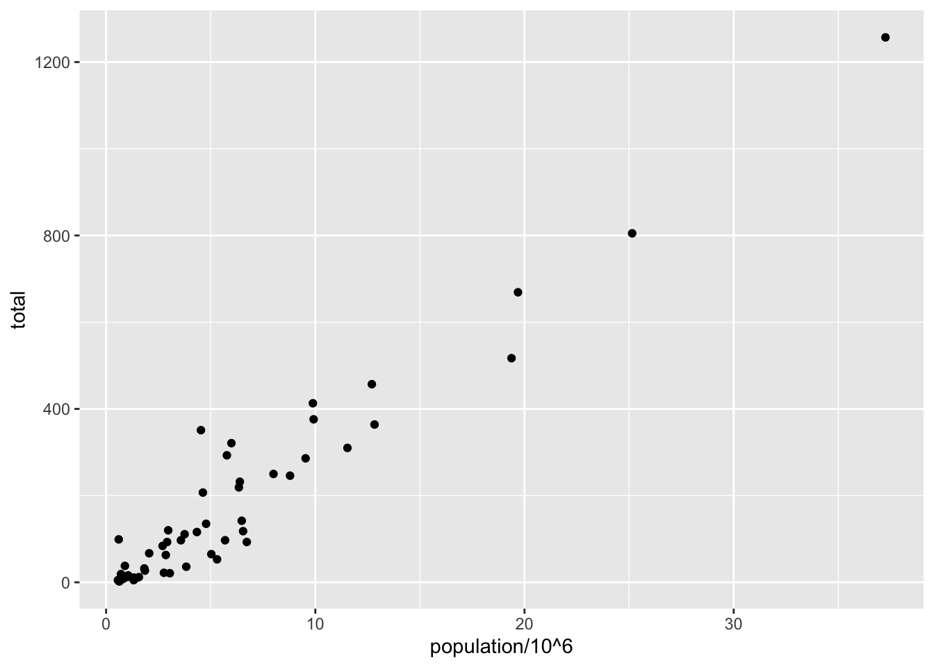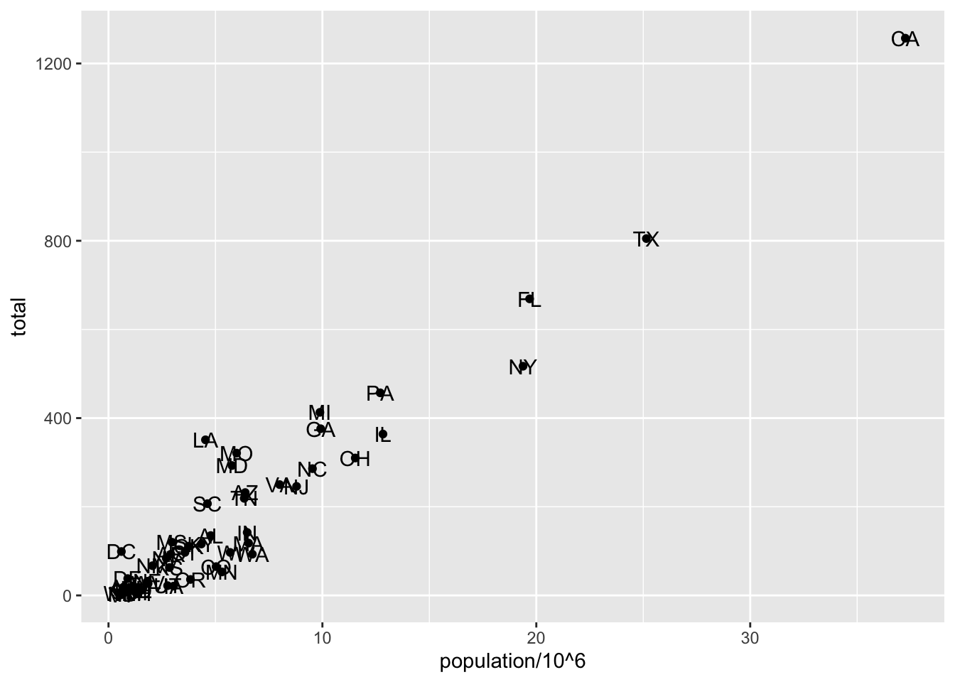 p +geom_point(aes(x = population/10^6, y = total)) +geom_text(aes(population/10^6, total), label = abb)