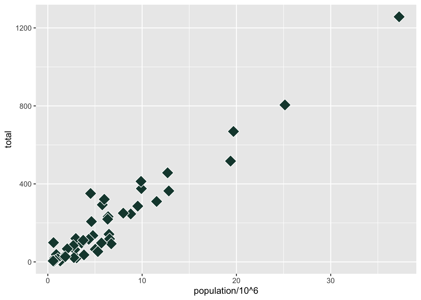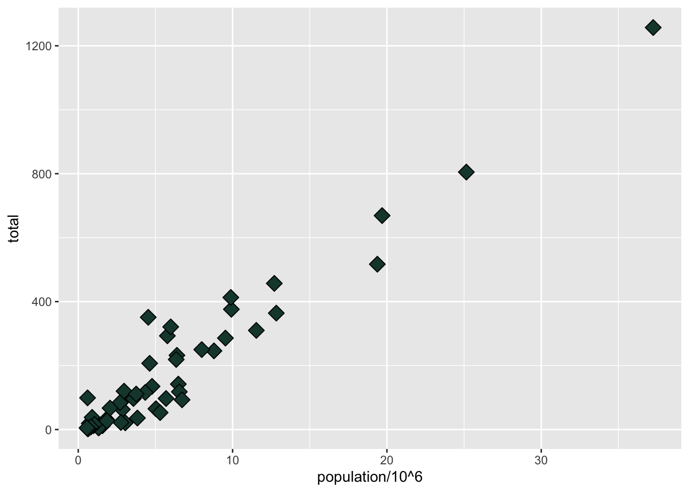 p +geom_point(aes(x = population/10^6, y = total), size =4, shape =23, fill ='#18453B')
