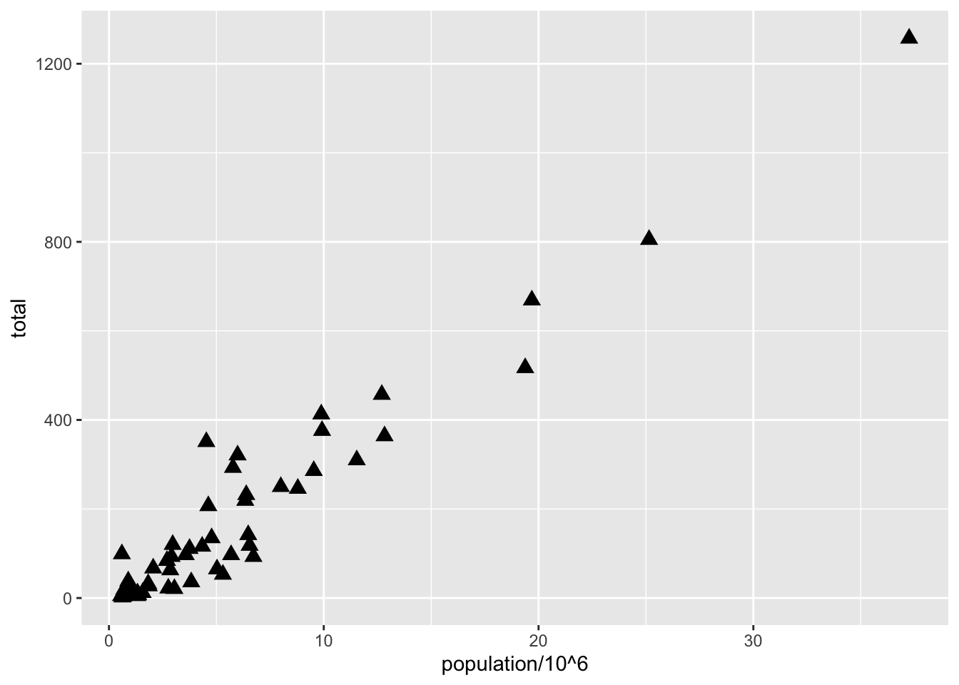 p +geom_point(aes(x = population/10^6, y = total), size =3, shape =17)