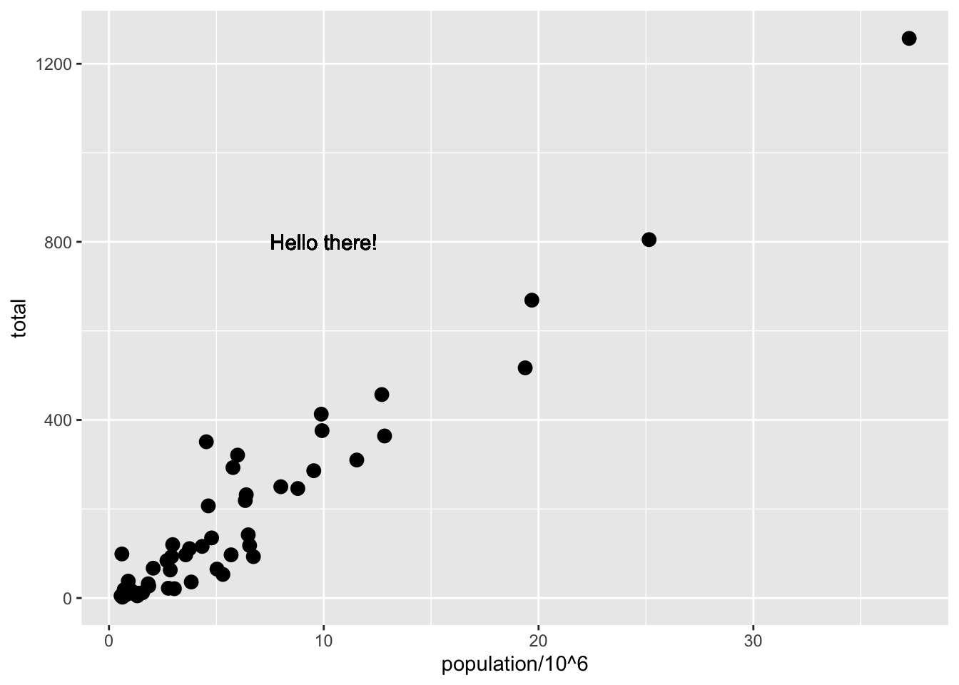 p +geom_point(size =3) +geom_text(aes(x =10, y =800, label ="Hello there!"))