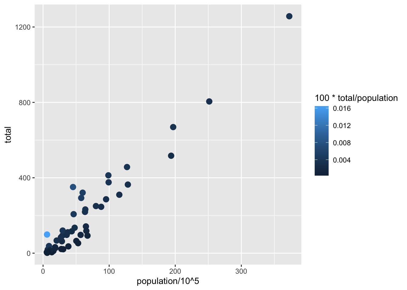 Let’s see a useful example of a continuous aesthetic mapping to color. In our data, we are making a scatterplot of population and total murders, which really just shows that states with higher populations have higher murders. What we really want is murders per capita (I think COVID taught us a lot about rates vs. levels like “cases” and “cases per 100,000 people”). We can create a variable of “murders per capita” on the fly. Since “murders per capita” is a very small number and hard to read, we’ll multiply by 100 so that we get “percent of population murdered per year”: