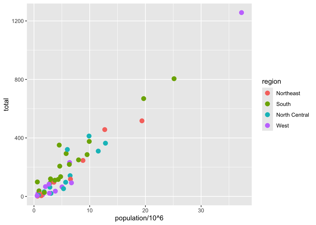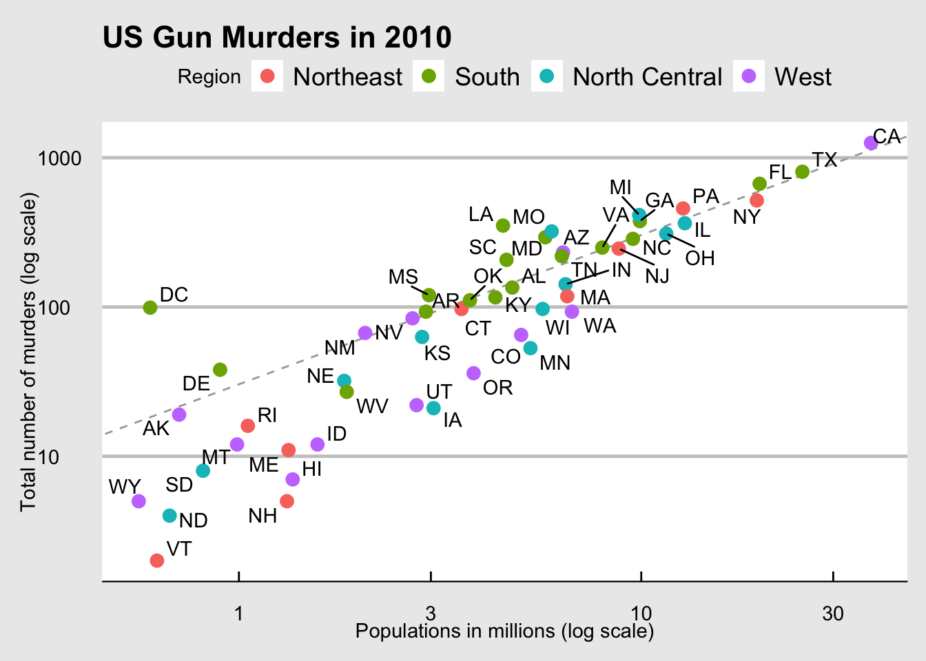 We can clearly see how much states vary across population size and the total number of murders. Not surprisingly, we also see a clear relationship between murder totals and population size. A state falling on the dashed grey line has the same murder rate as the US average. The four geographic regions are denoted with color, which depicts how most southern states have murder rates above the average.
