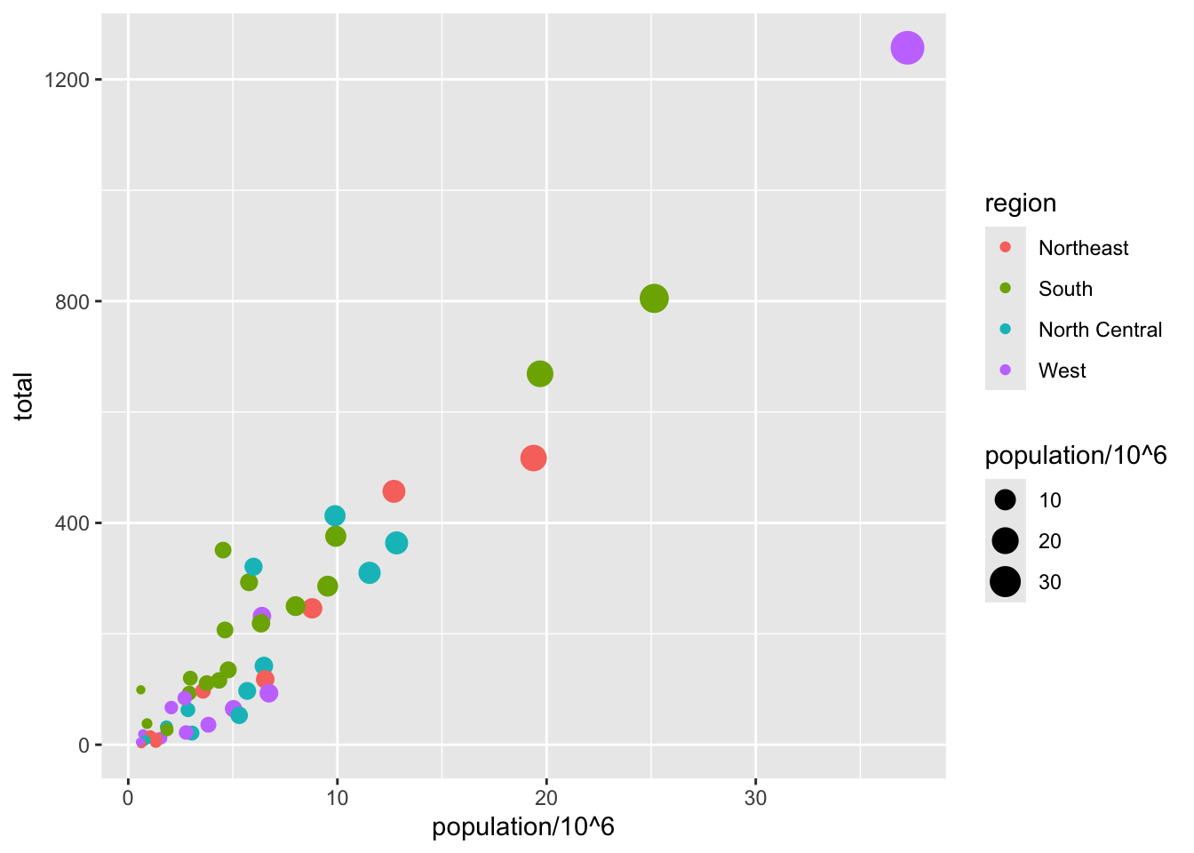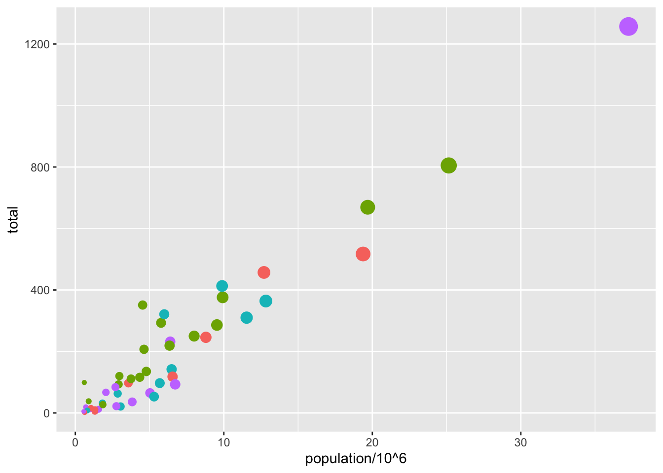 p +geom_point(aes(x = population/10^6, y = total, color = region, size = population/10^6), show.legend =FALSE)