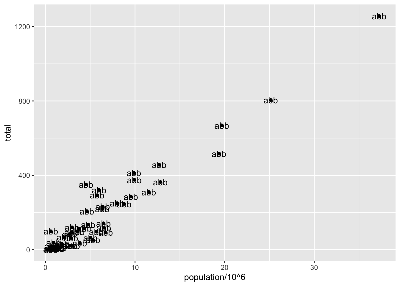 p +geom_point(aes(x = population/10^6, y = total)) +geom_text(aes(population/10^6, total), label ='abb')