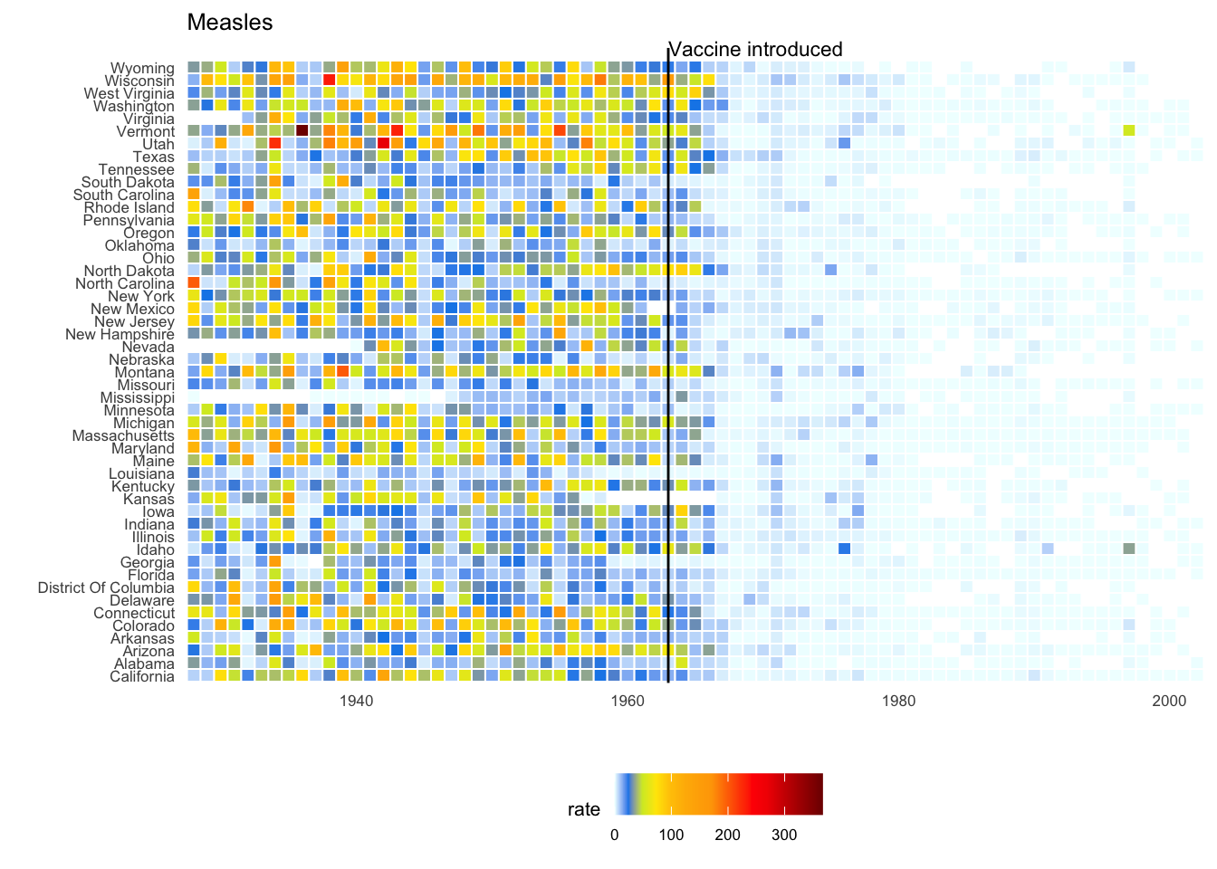 A particularly salient example—given the current state of the world—is a Wall Street Journal article1 showing data related to the impact of vaccines on battling infectious diseases. One of the graphs shows measles cases by US state through the years with a vertical line demonstrating when the vaccine was introduced.