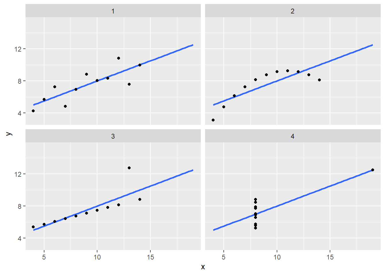 Correlation is not always a good summary of the relationship between two variables. The following four artificial datasets, referred to as Anscombe’s quartet, famously illustrate this point. All these pairs have a correlation of 0.82: