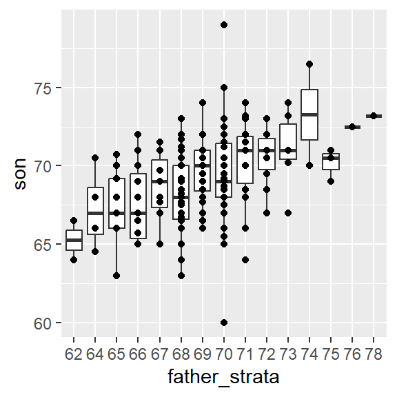 If we want to make a prediction of any height, not just 72, we could apply the same approach to each strata. Stratification followed by boxplots lets us see the distribution of each group: