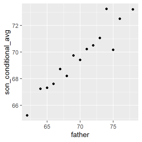 Not surprisingly, the centers of the groups are increasing with height. Furthermore, these centers appear to follow a linear relationship. Below we plot the averages of each group. If we take into account that these averages are random variables with standard errors, the data is consistent with these points following a straight line: