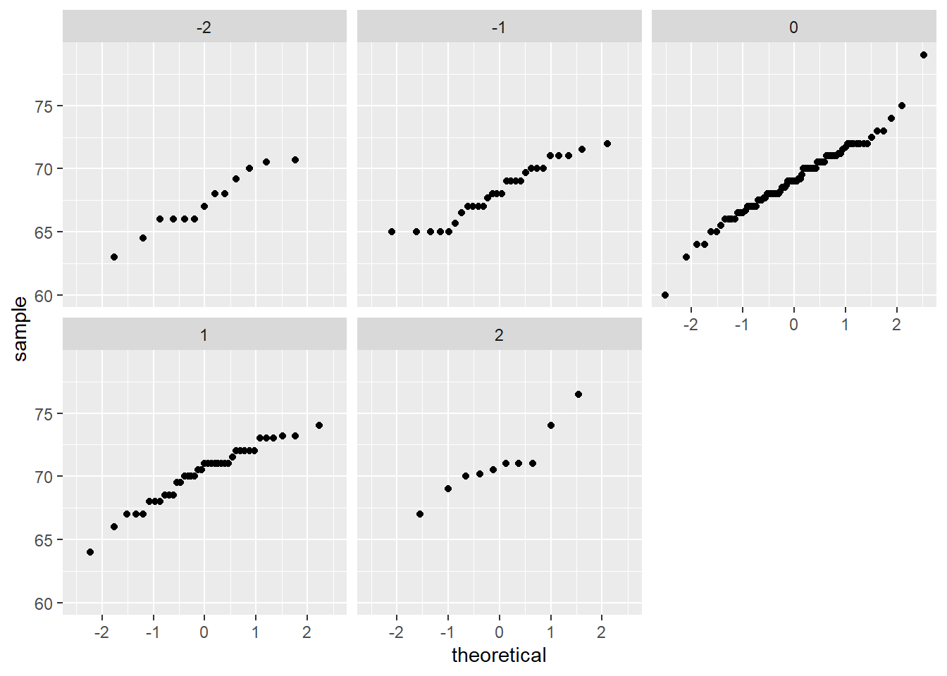 If we think the height data is well approximated by the bivariate normal distribution, then we should see the normal approximation hold for each strata. Here we stratify the son heights by the standardized father heights and see that the assumption appears to hold: