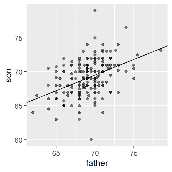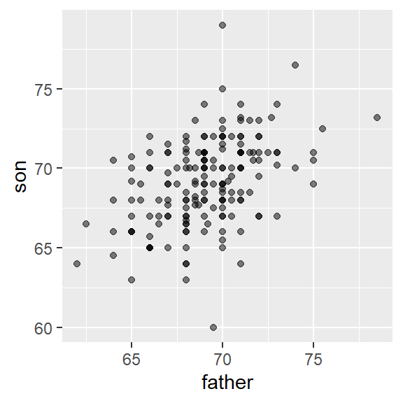 galton_heights %>% summarize(r = cor(father, son)) %>% pull(r)[1] 0.4334102