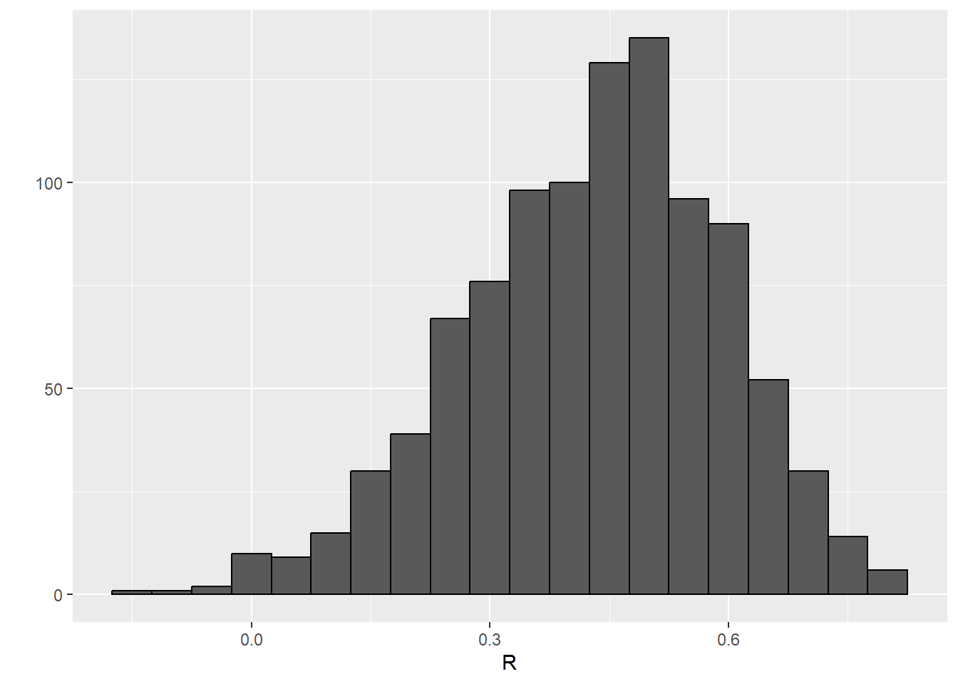 summarize(r = cor(father, son)) %>% pull(r)R is a random variable. We can run a Monte Carlo simulation to see its distribution: