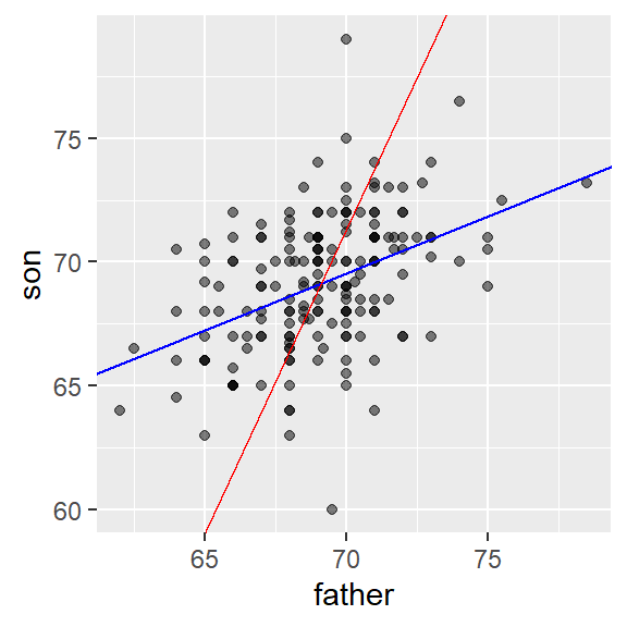Here is a plot showing the two regression lines, with blue for the predicting son heights with father heights and red for predicting father heights with son heights:
