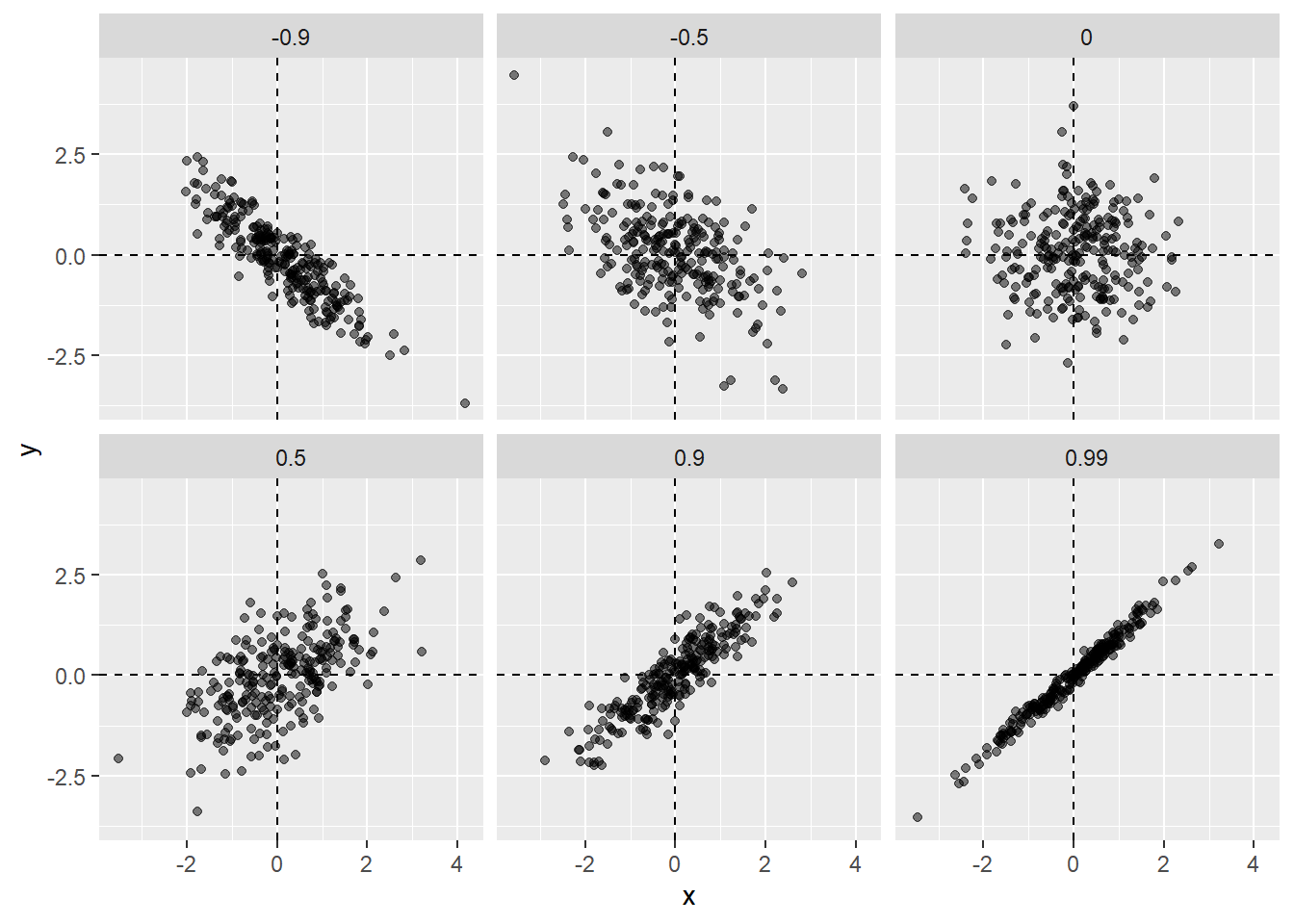 rho <- mean(scale(x) * scale(y))To understand why this equation does in fact summarize how two variables move together, consider the