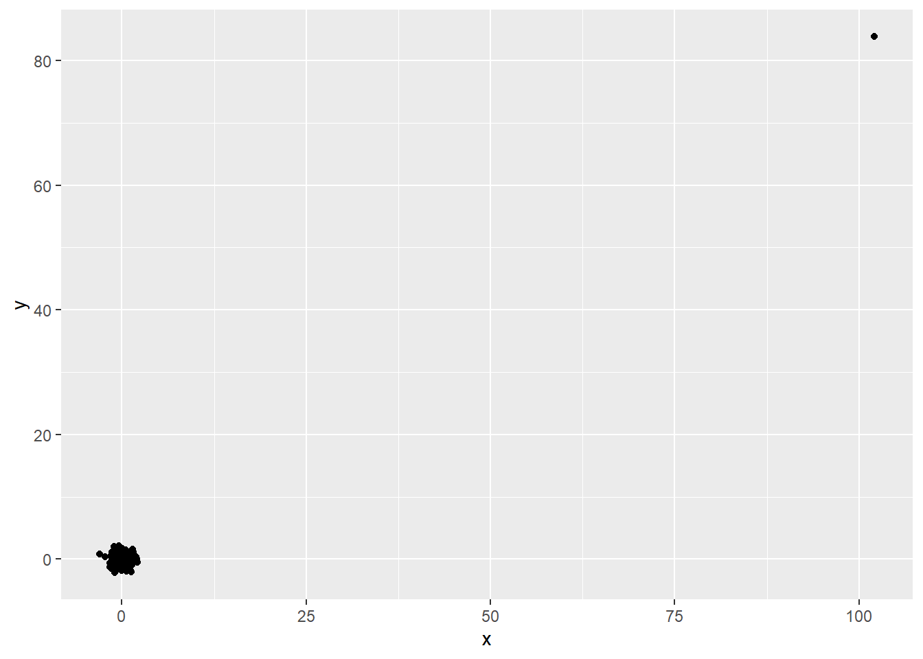 But this is driven by the one outlier. If we remove this outlier, the correlation is greatly reduced to almost 0, which is what it should be: