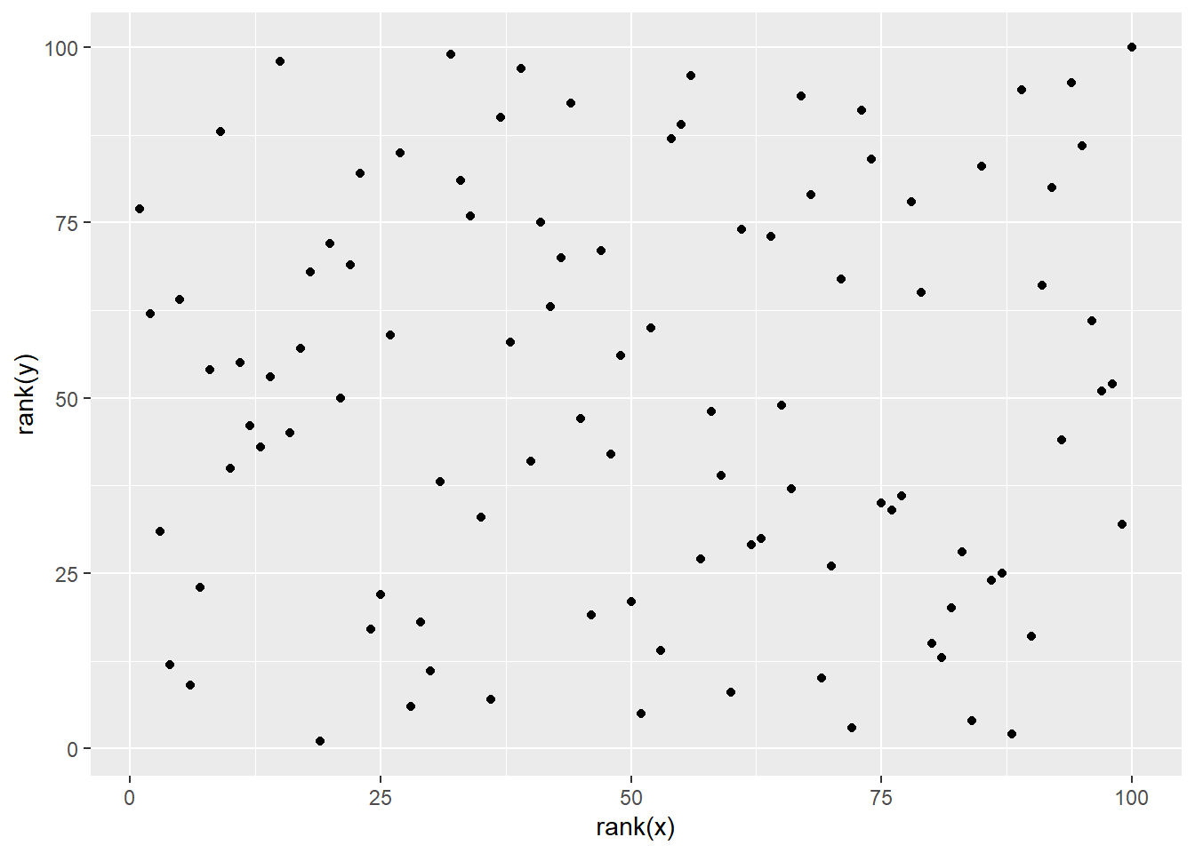 Previously, we (briefly) described alternatives to the average and standard deviation that are robust to outliers. There is also an alternative to the sample correlation for estimating the population correlation that is robust to outliers. It is called Spearman correlation. The idea is simple: compute the correlation on the ranks of the values. Here is a plot of the ranks plotted against each other: