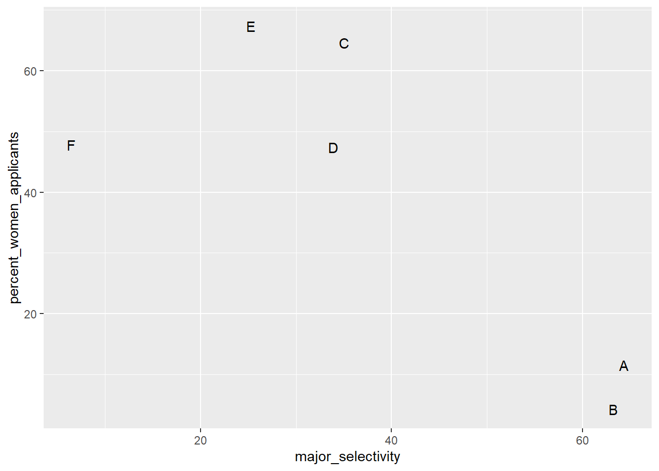 Now we see that major by major, there is not much difference. The size of the dot represents the number of applicants, and explains the paradox: we see large red dots and small blue dots for the easiest (least selective) majors, A and B.