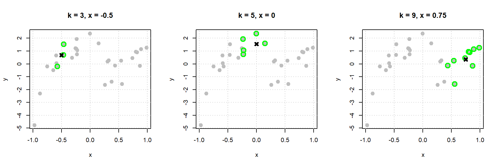 at we use the three nearest neighbors, which are highlighted with green. Our estimate is the average of the values of these three points indicated by the black x. - In the middle plot, to estimate the mean of